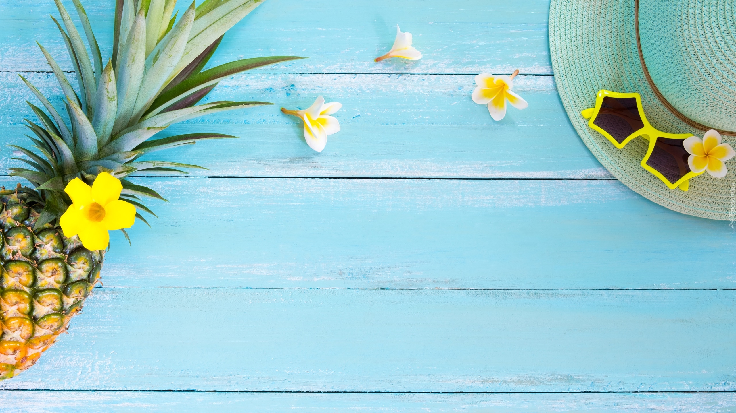 Edytor tapety: Ananas i kapelusz na niebieskich deskach
