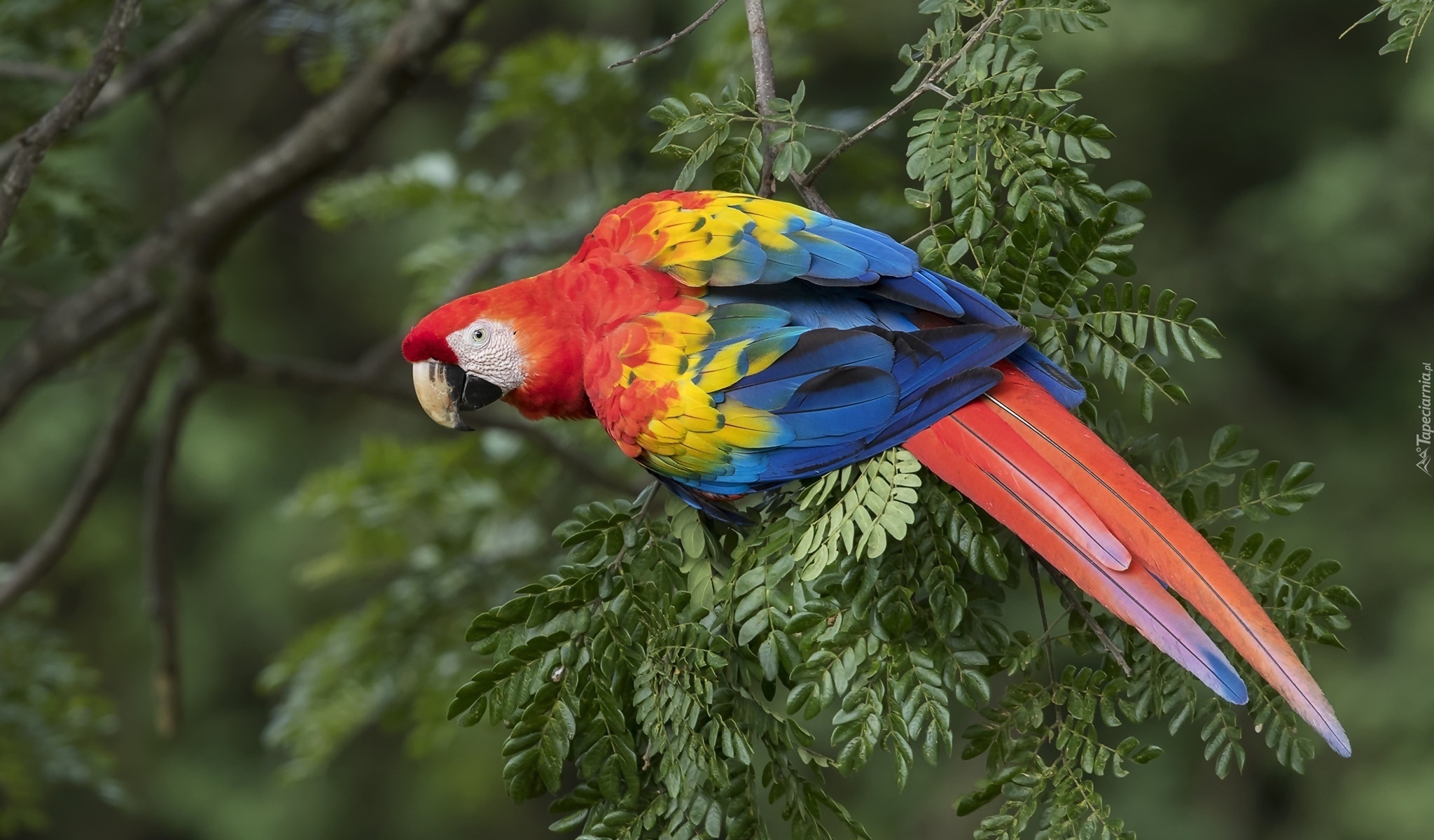 Edytor tapety: Ara żółtoskrzydła na liściastej gałązce