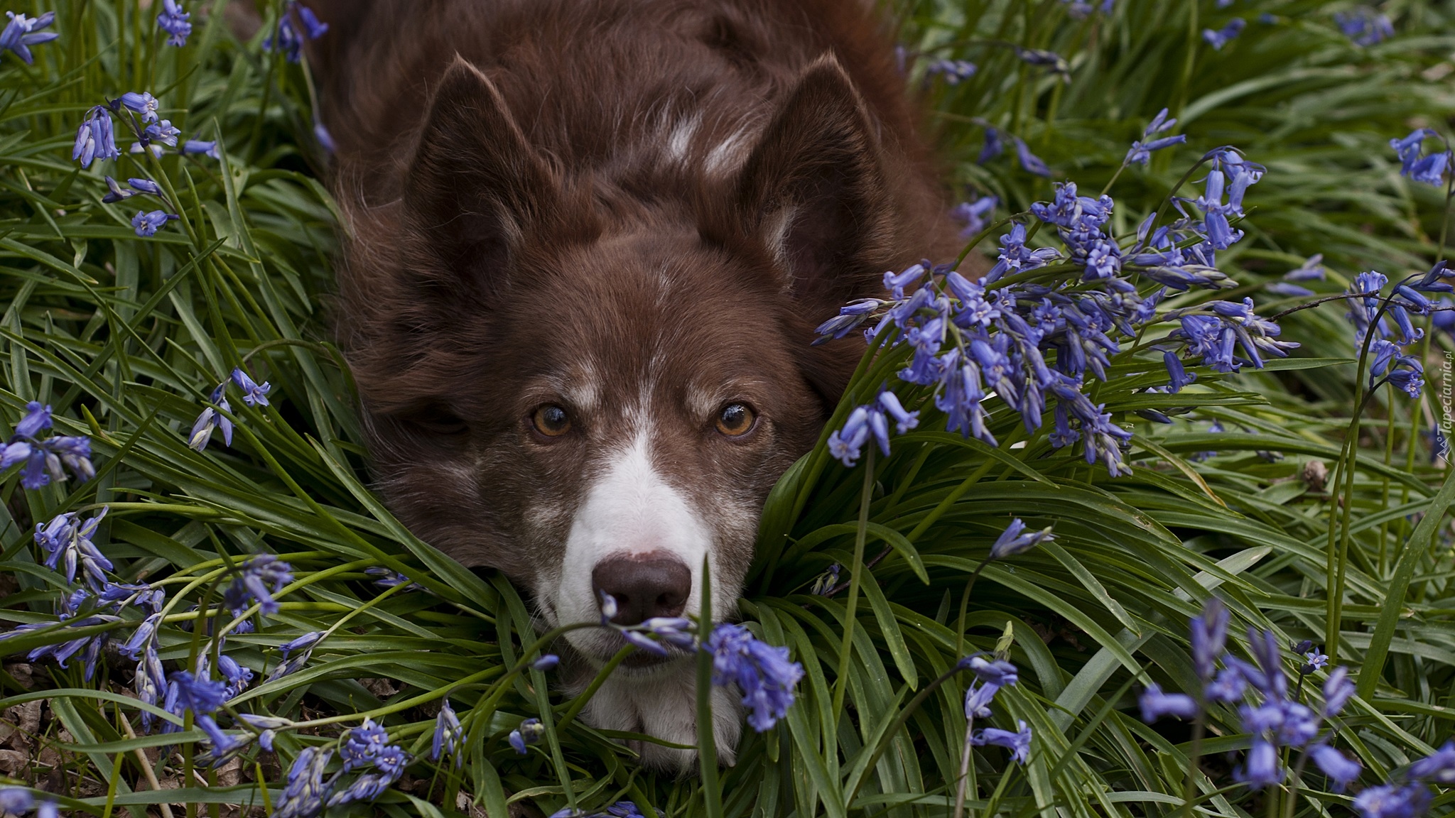Edytor tapety: Border collie pośród niebieskich kwiatów