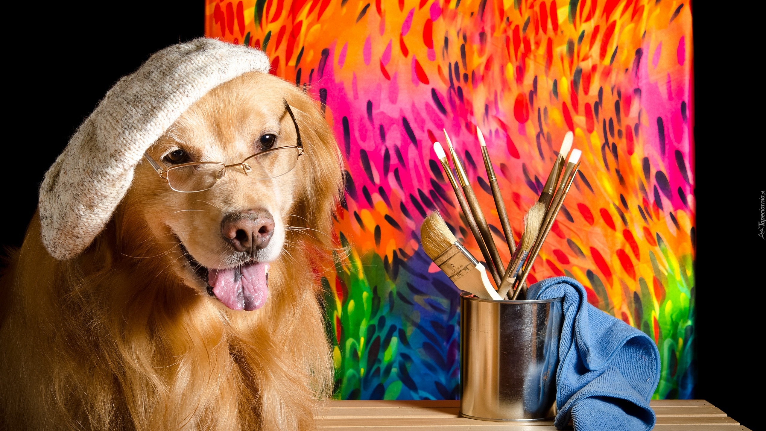 Edytor tapety: Golden retriever w czapce i okularach