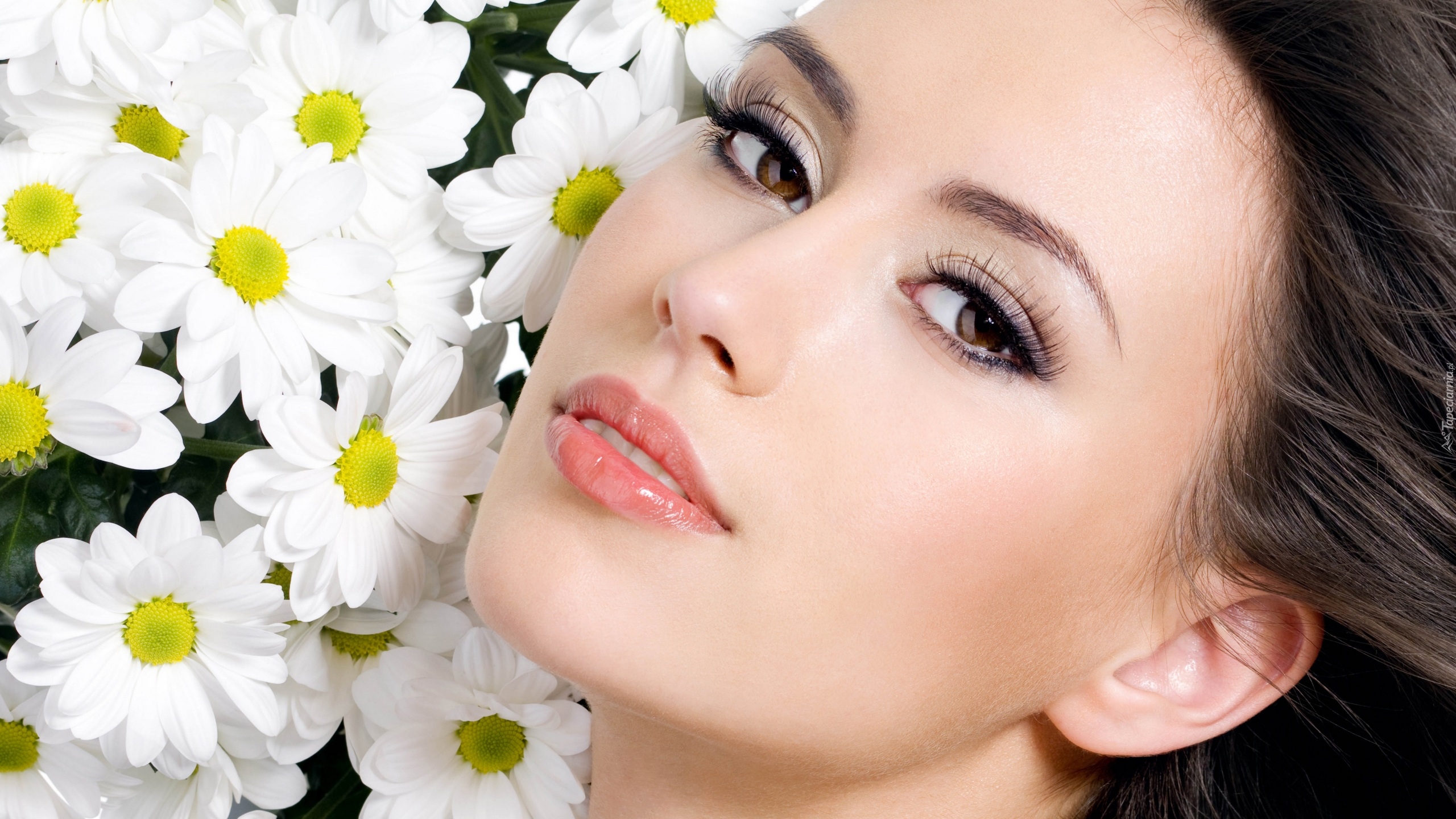 Edytor tapety: Twarz kobiety na tle margerytek