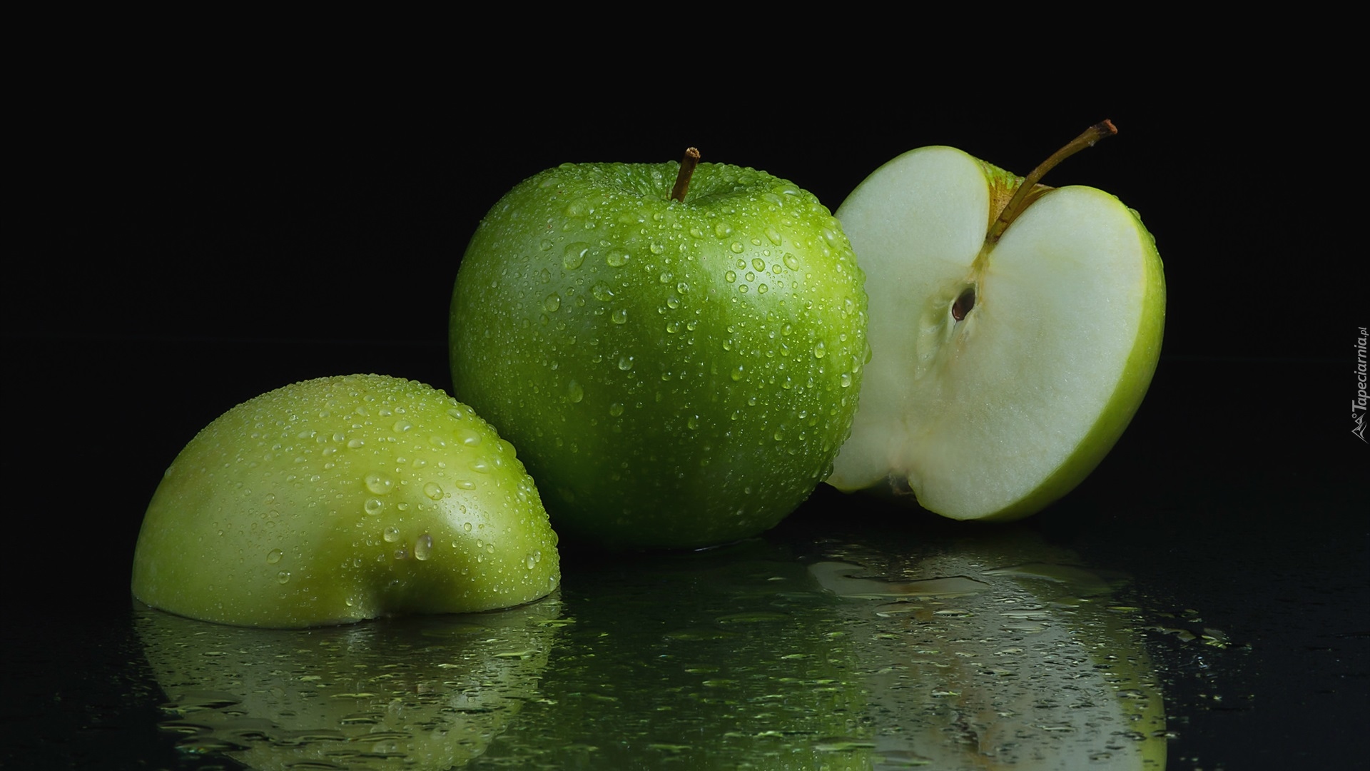 Edytor tapety: Zielone jabłka w kroplach wody