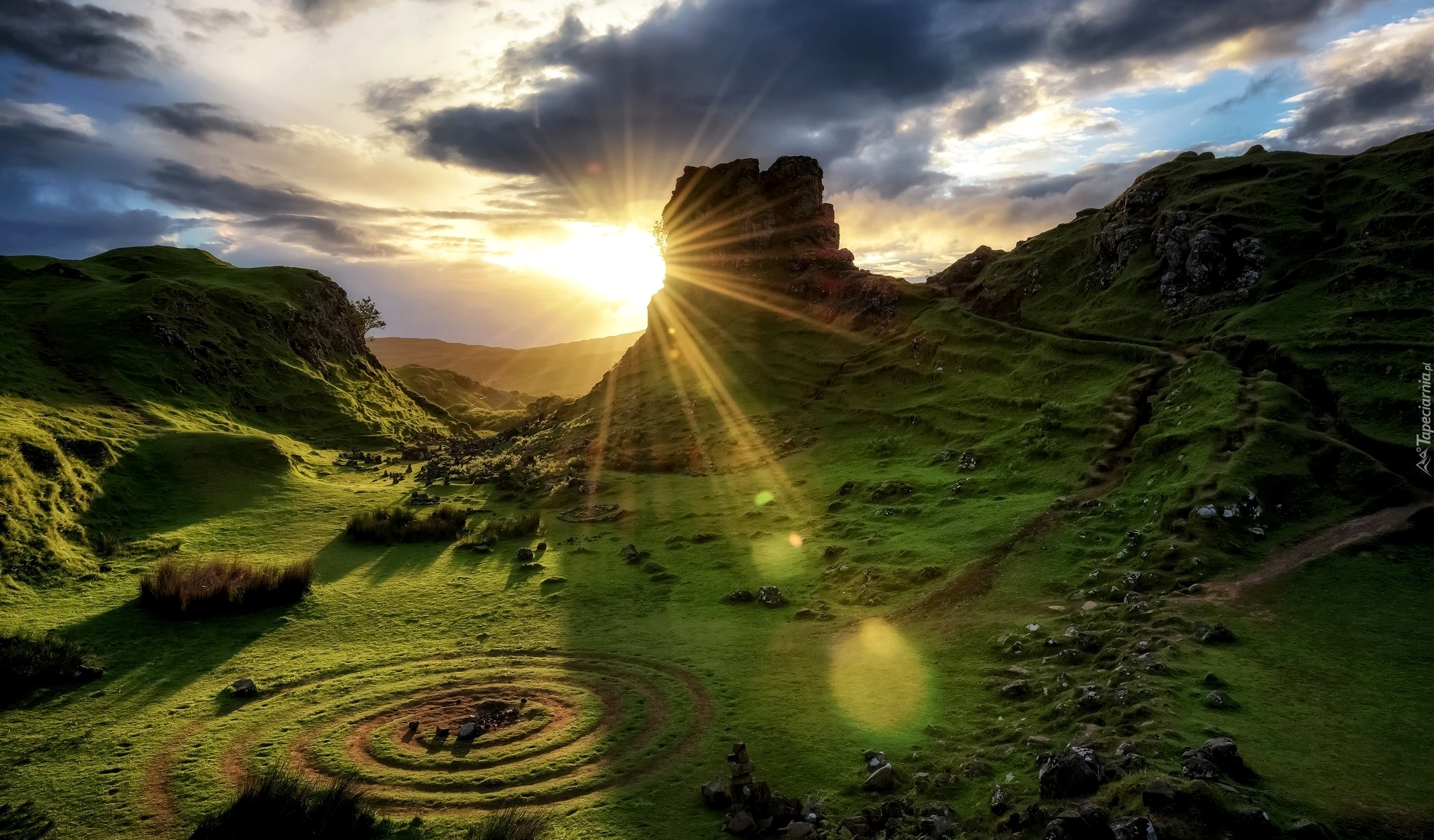 Edytor tapety: Kręgi na łące pośród skał w promieniach słońca