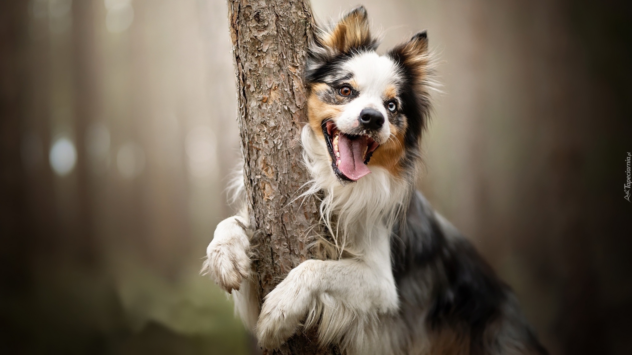 Edytor tapety: Border collie obejmuje drzewo