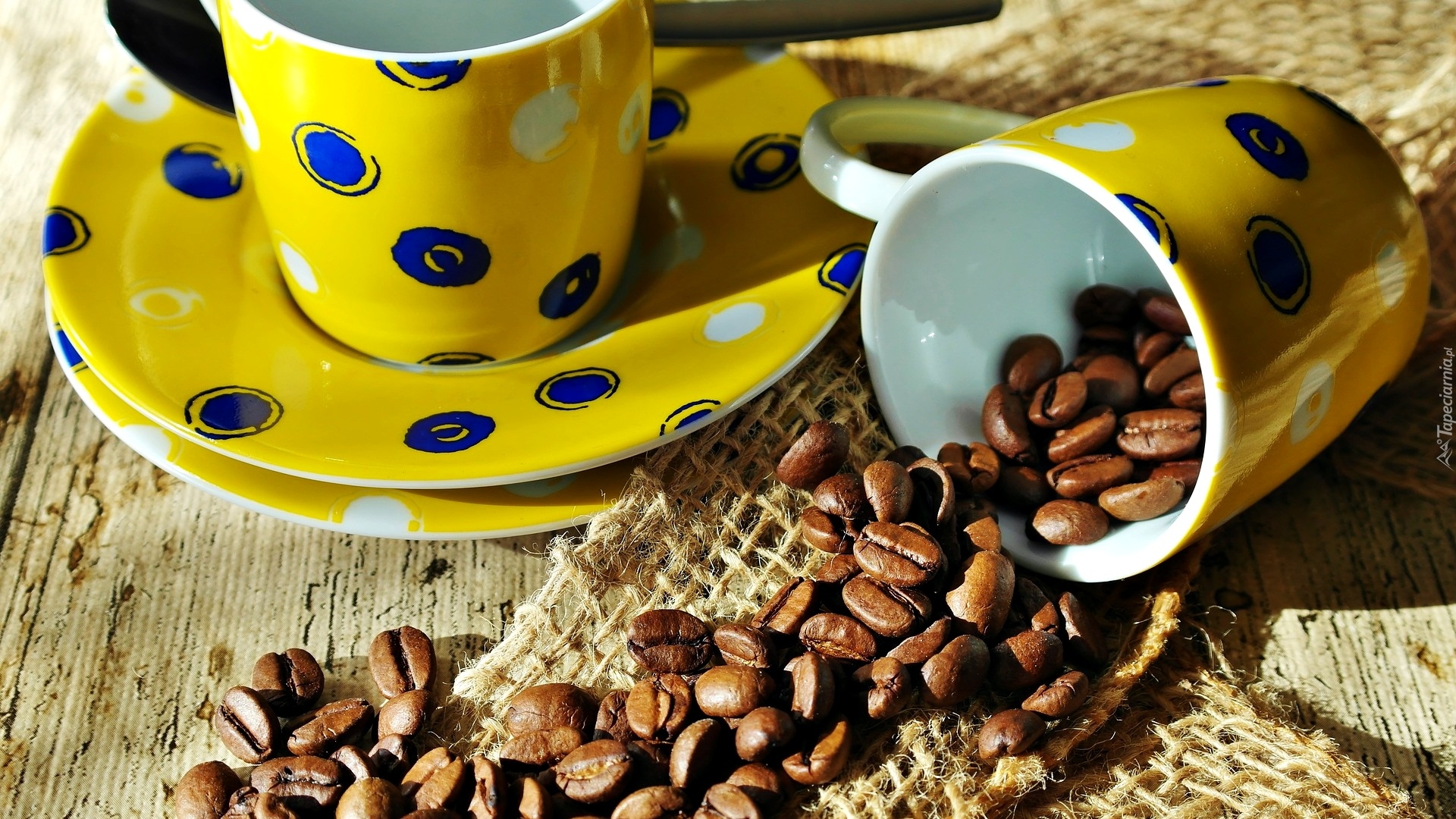 Edytor tapety: Żółte filiżanki z ziarnami kawy
