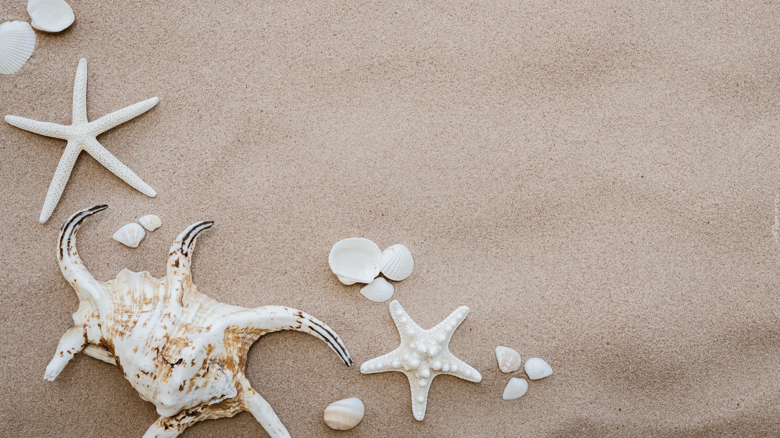 Edytor tapety: Białe muszelki i rozgwiazdy na piasku