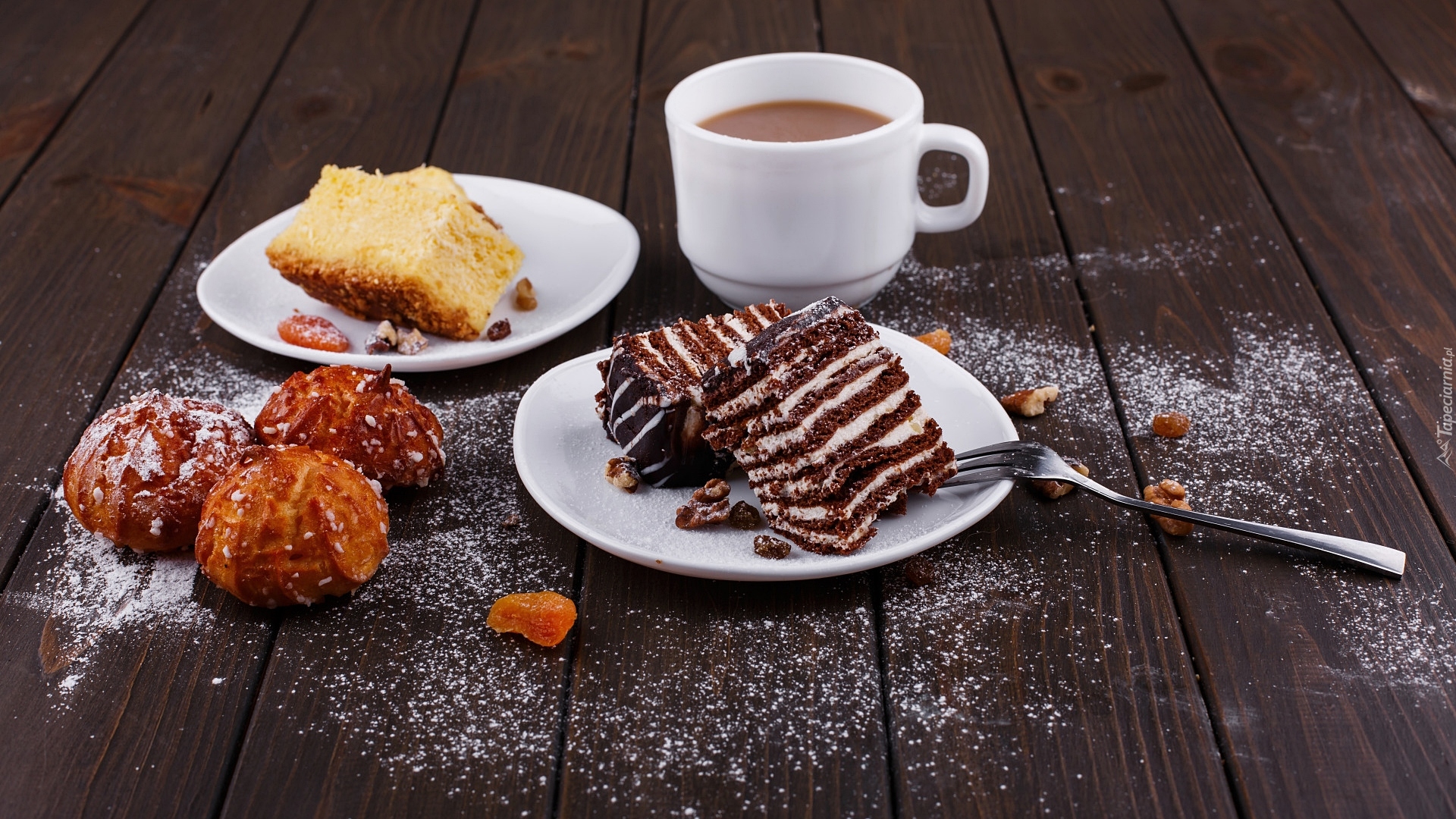 Edytor tapety: Porcje ciast obok filiżanki i małych pączków