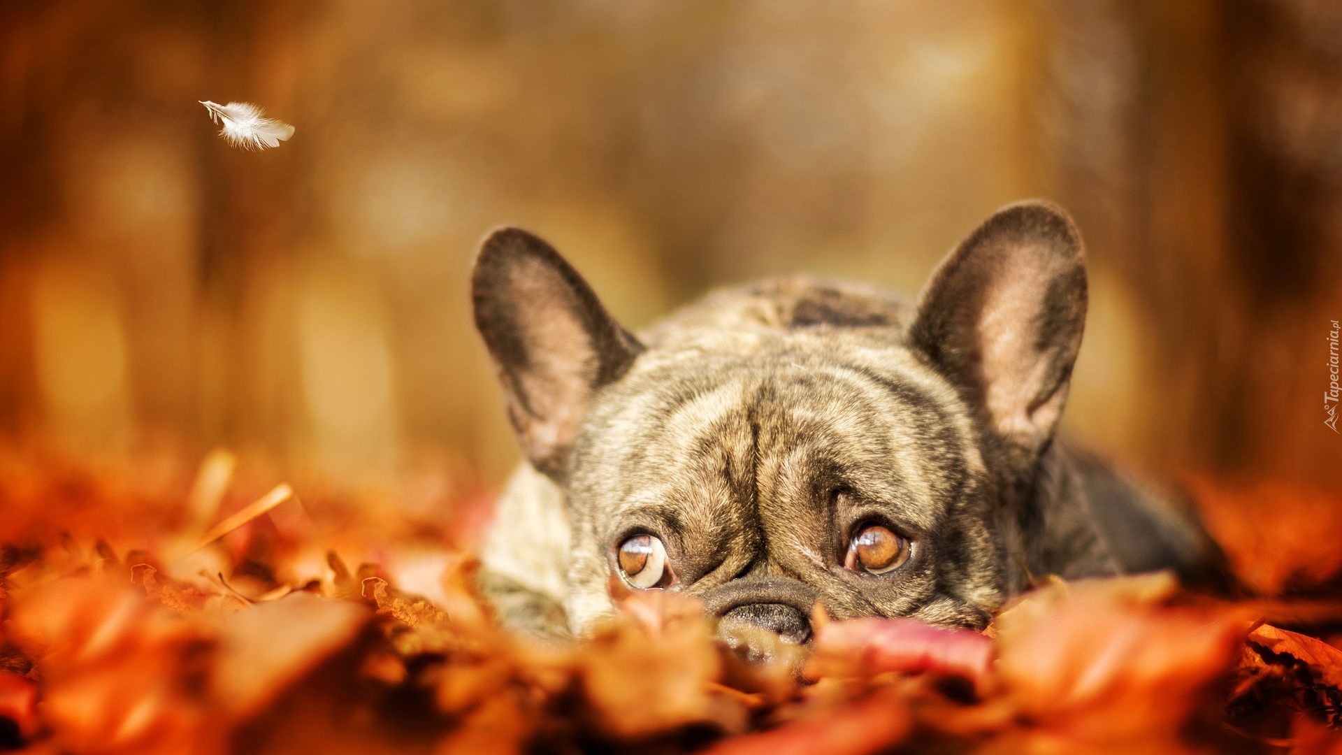 Edytor tapety: Buldog francuski zapatrzony w piórko