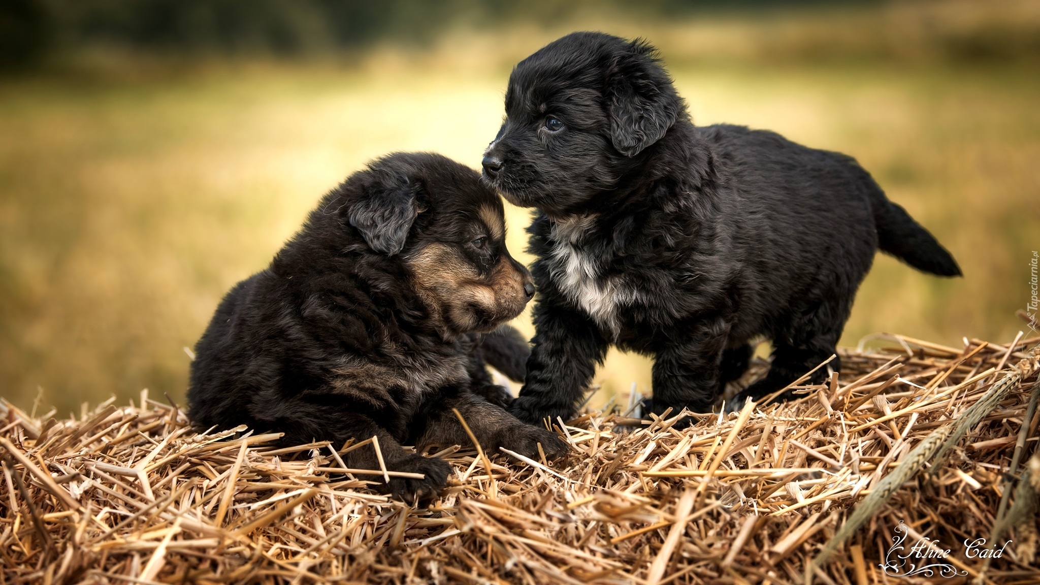Edytor tapety: Dwa czarne szczeniaki na słomie