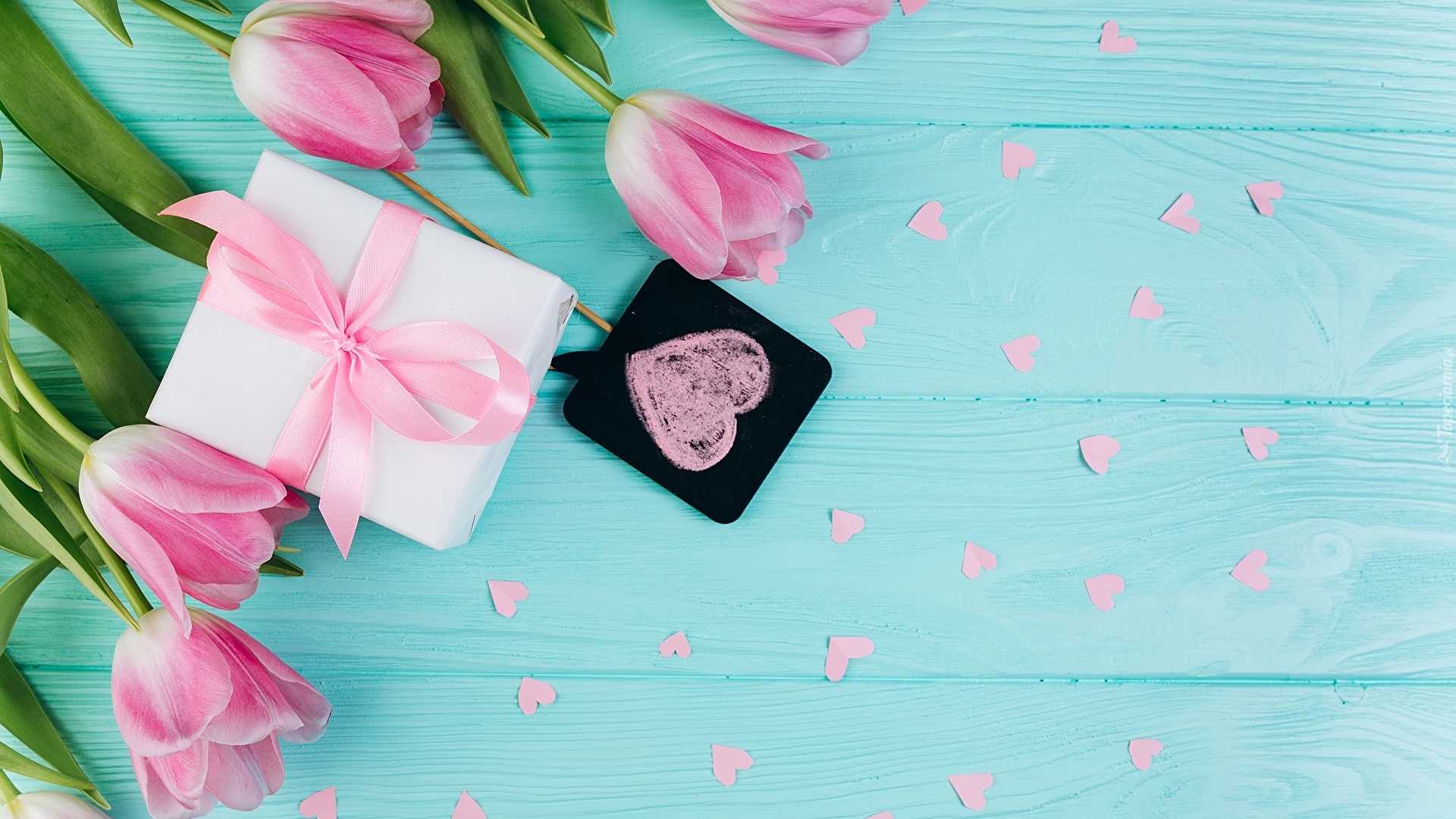 Edytor tapety: Prezent z kokardką obok tulipanów