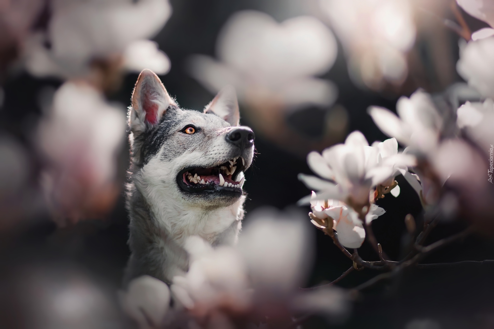 Edytor tapety: Wilczak czechosłowacki pośród magnolii