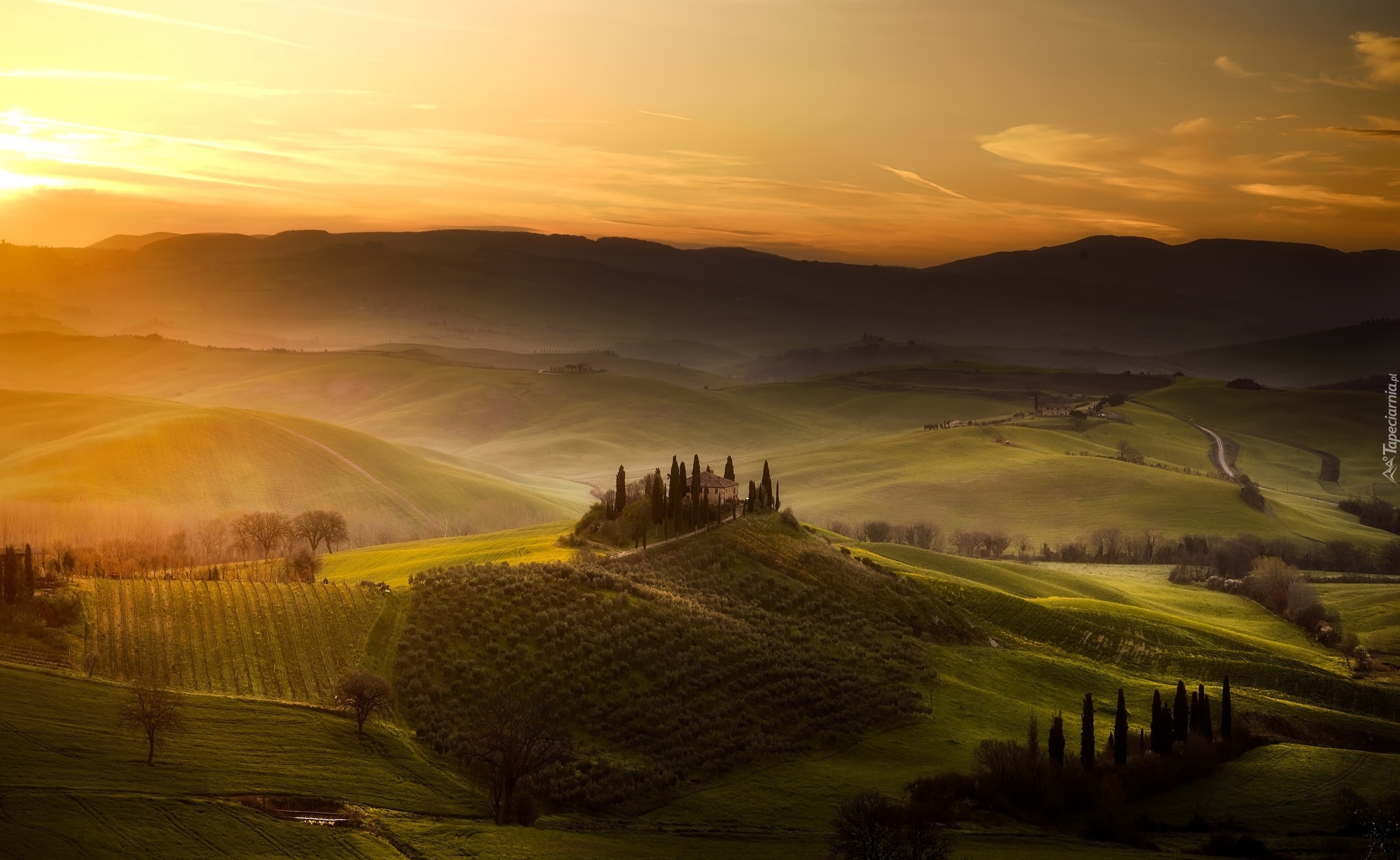 Edytor tapety: Wschód słońca na polach w Toskanii