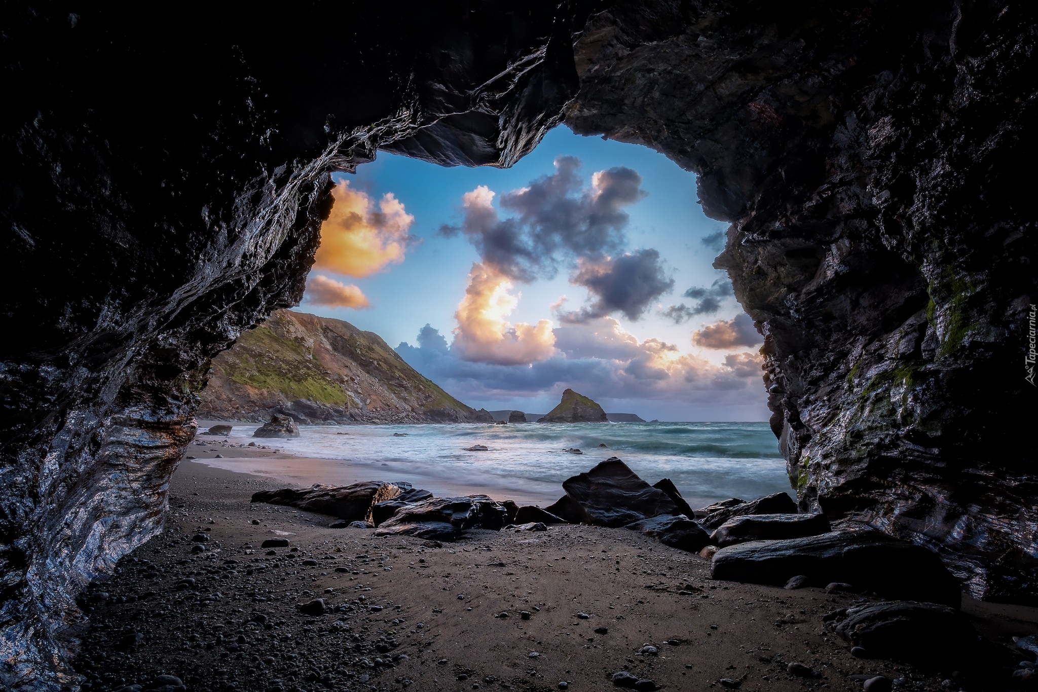 Edytor tapety: Widok z jaskini na morze i skały