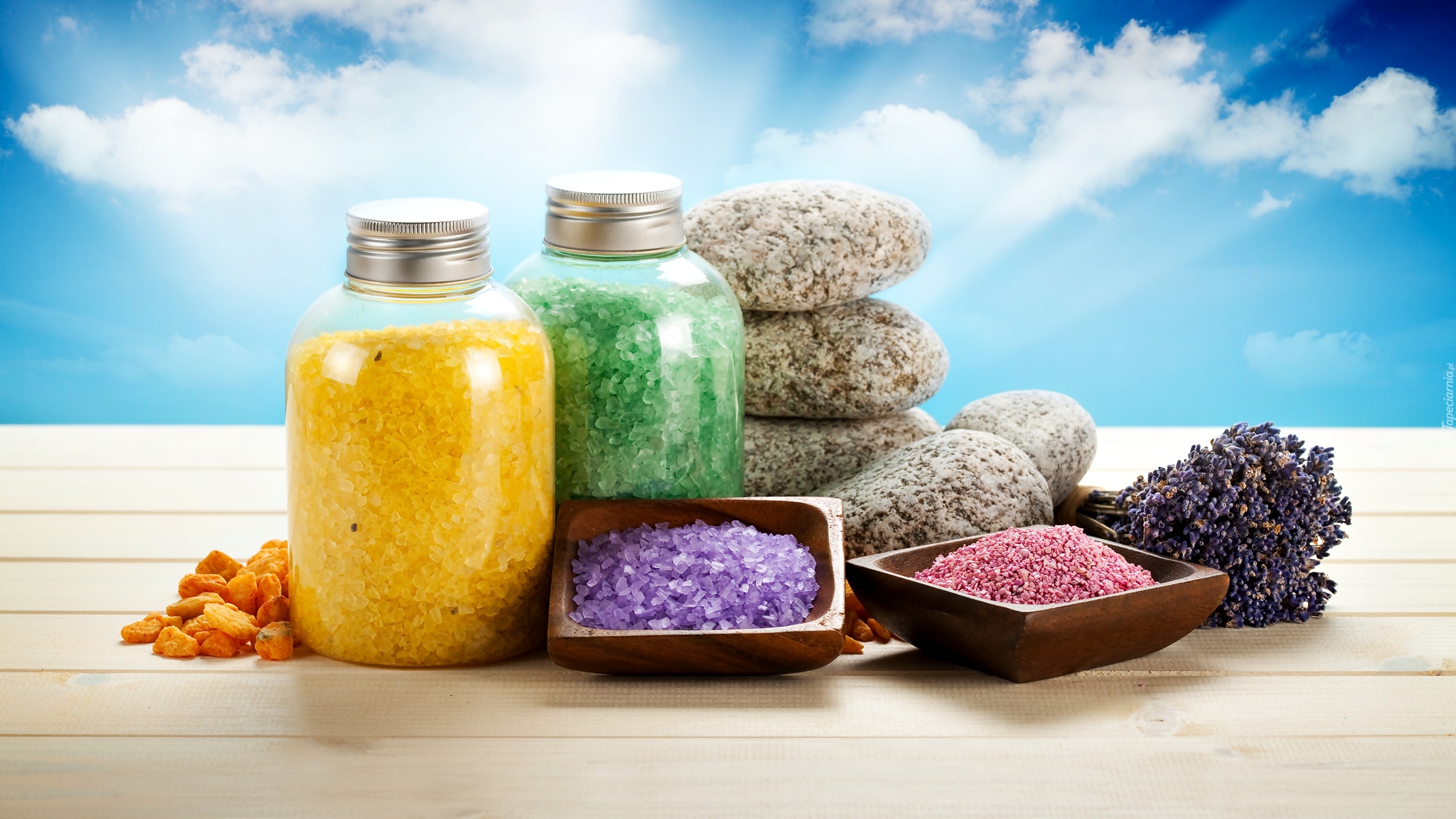 Edytor tapety: Kolorowa sól w słoikach i drewnianych miseczkach