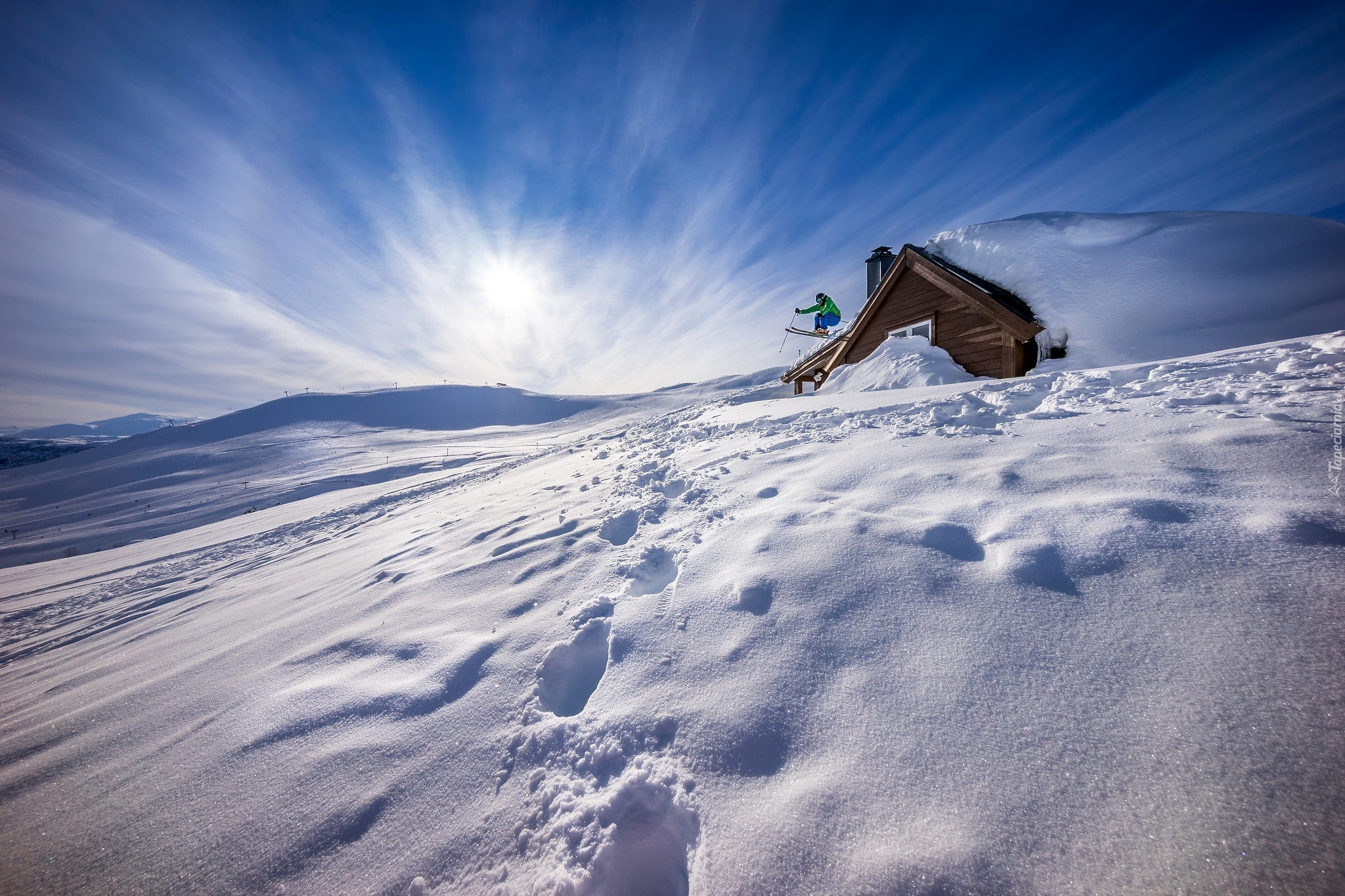 Edytor tapety: Narciarz nad zaśnieżonym dachem domu