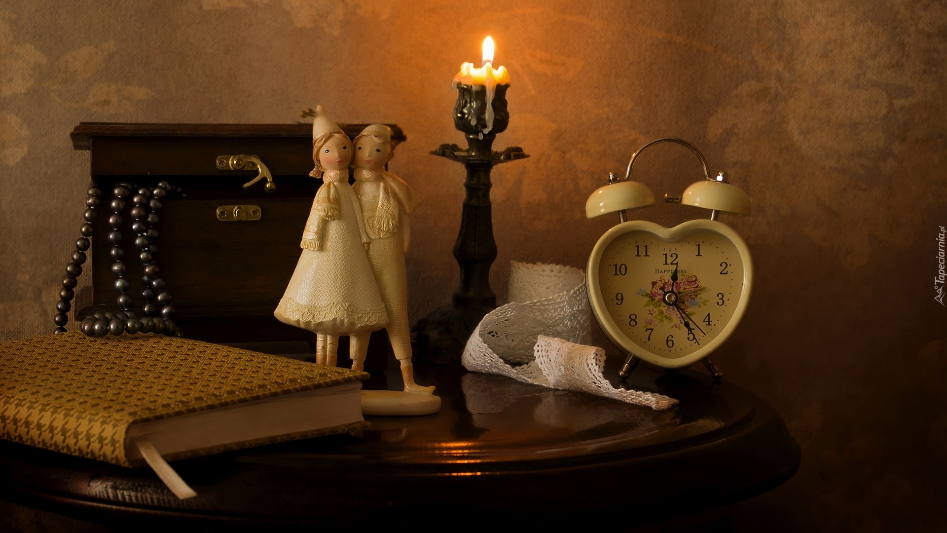 Edytor tapety: Zapalona świeczka obok figurki i budzika na stoliku
