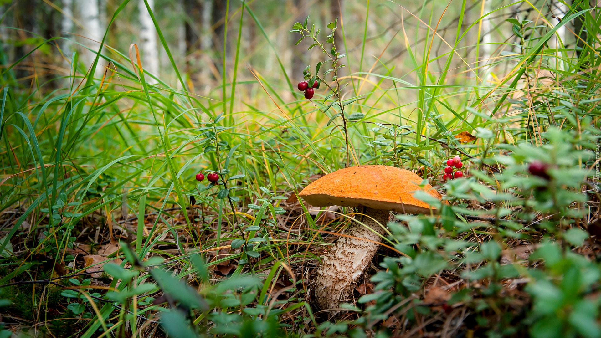 Edytor tapety: Koźlarz czerwony pośród czerwonych jagód