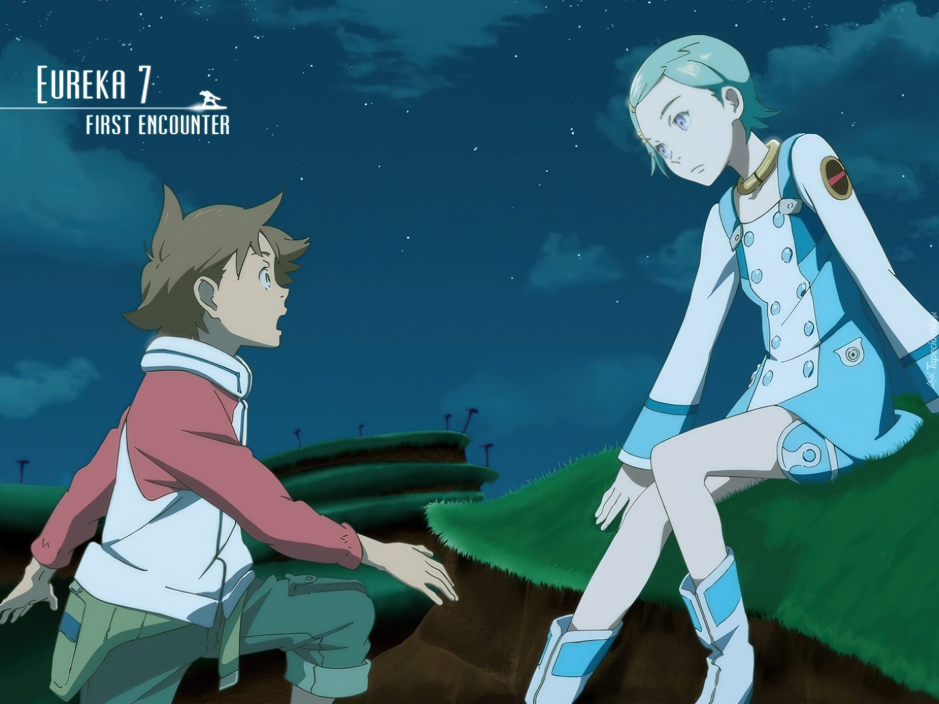 Edytor tapety: Eureka 7, noc, trawnik, rozmowa, gwiazdy