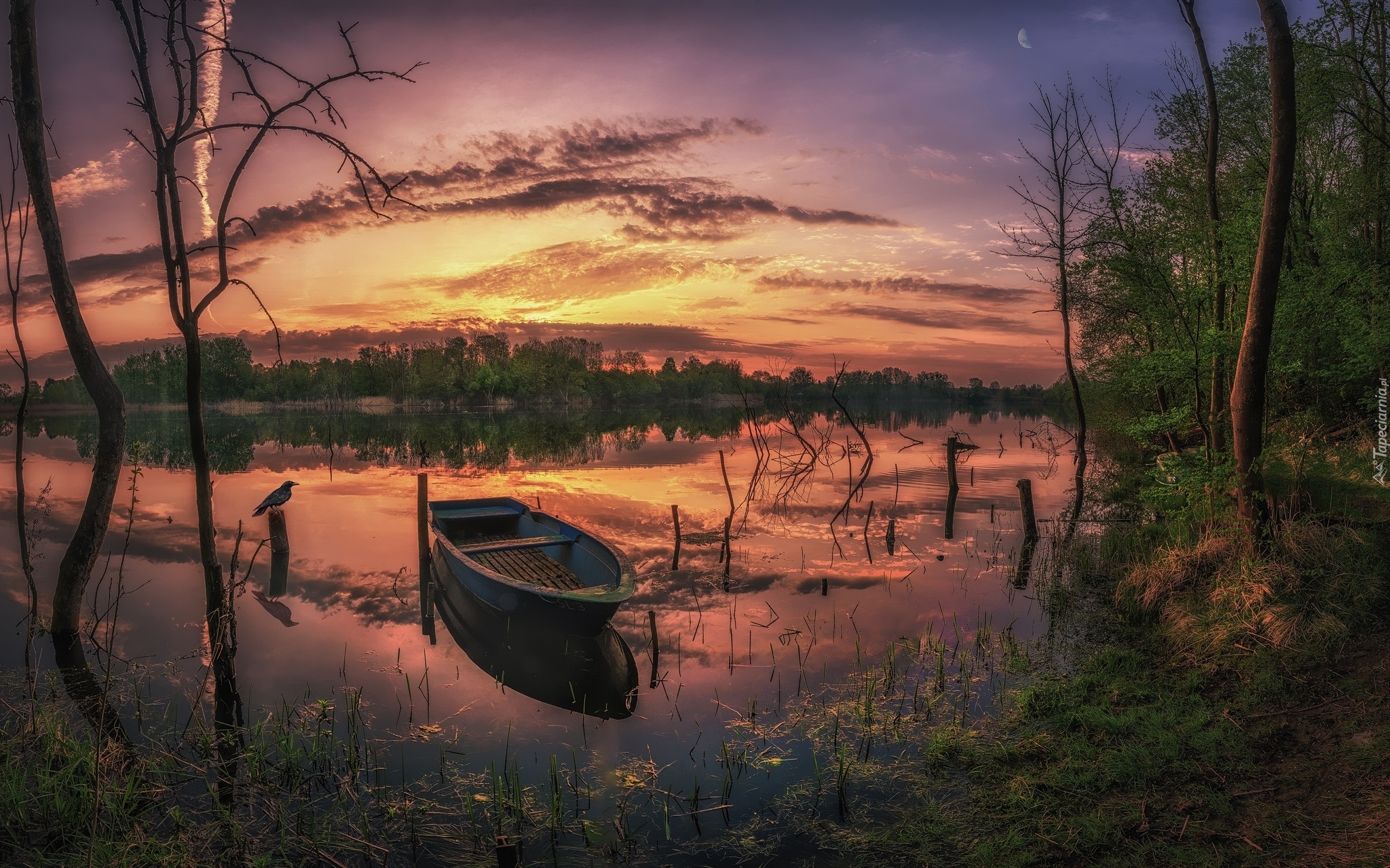 Edytor tapety: Łódka na brzegu jeziora w zachodzącym słońcu