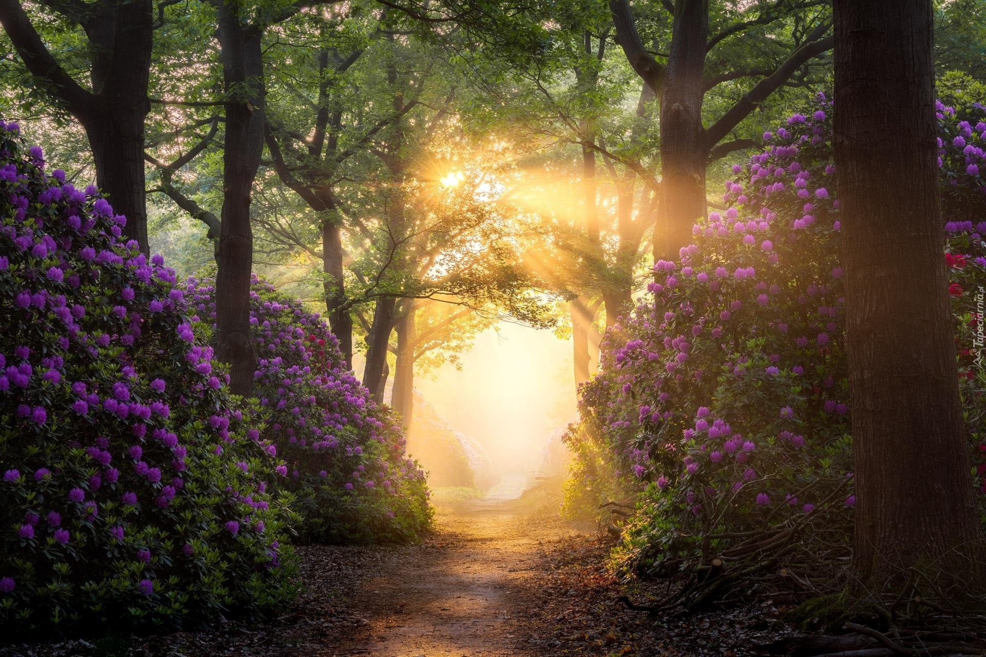 Edytor tapety: Różaneczniki przy leśnej drodze
