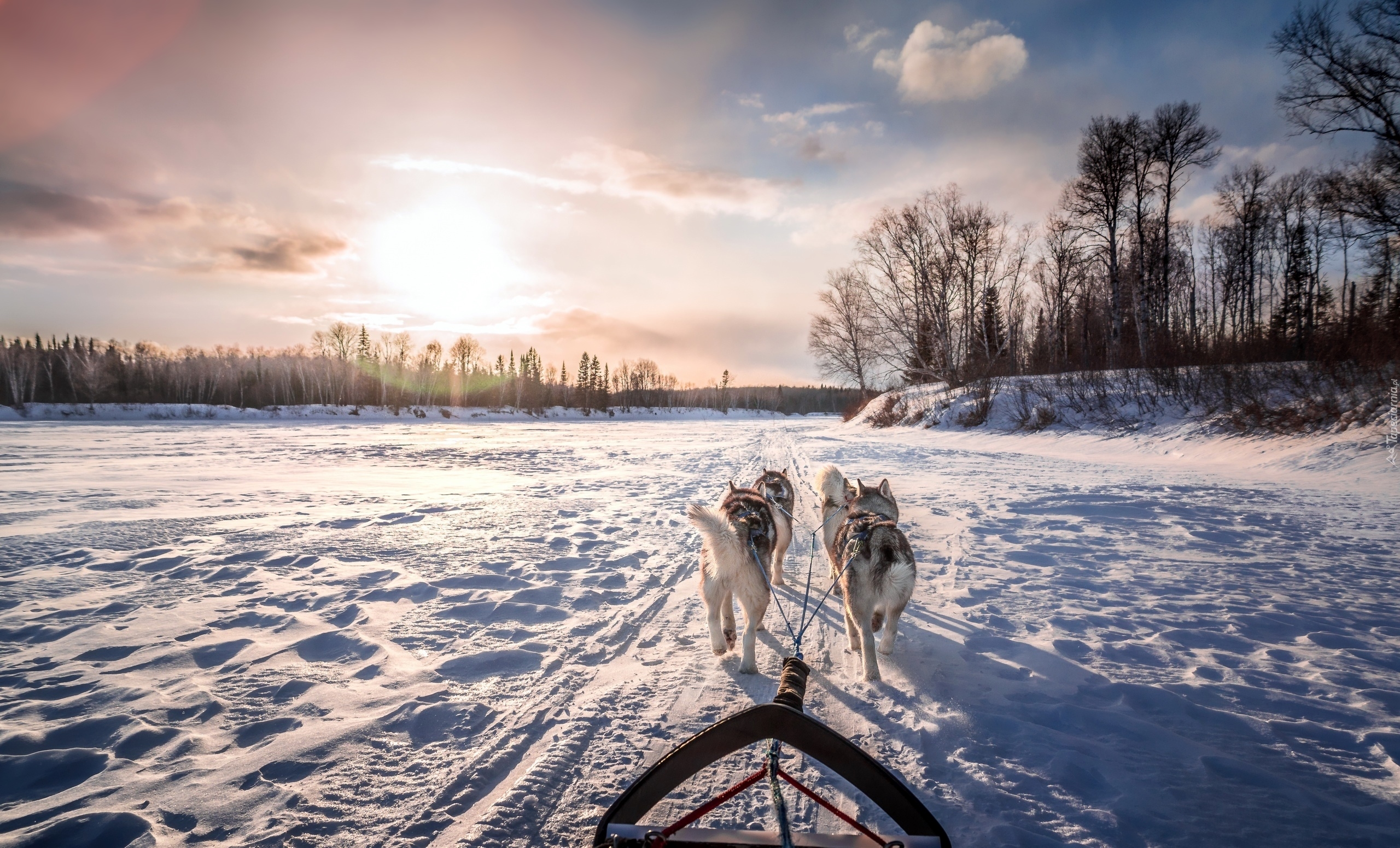 Edytor tapety: Siberian husky w zimowym zaprzęgu
