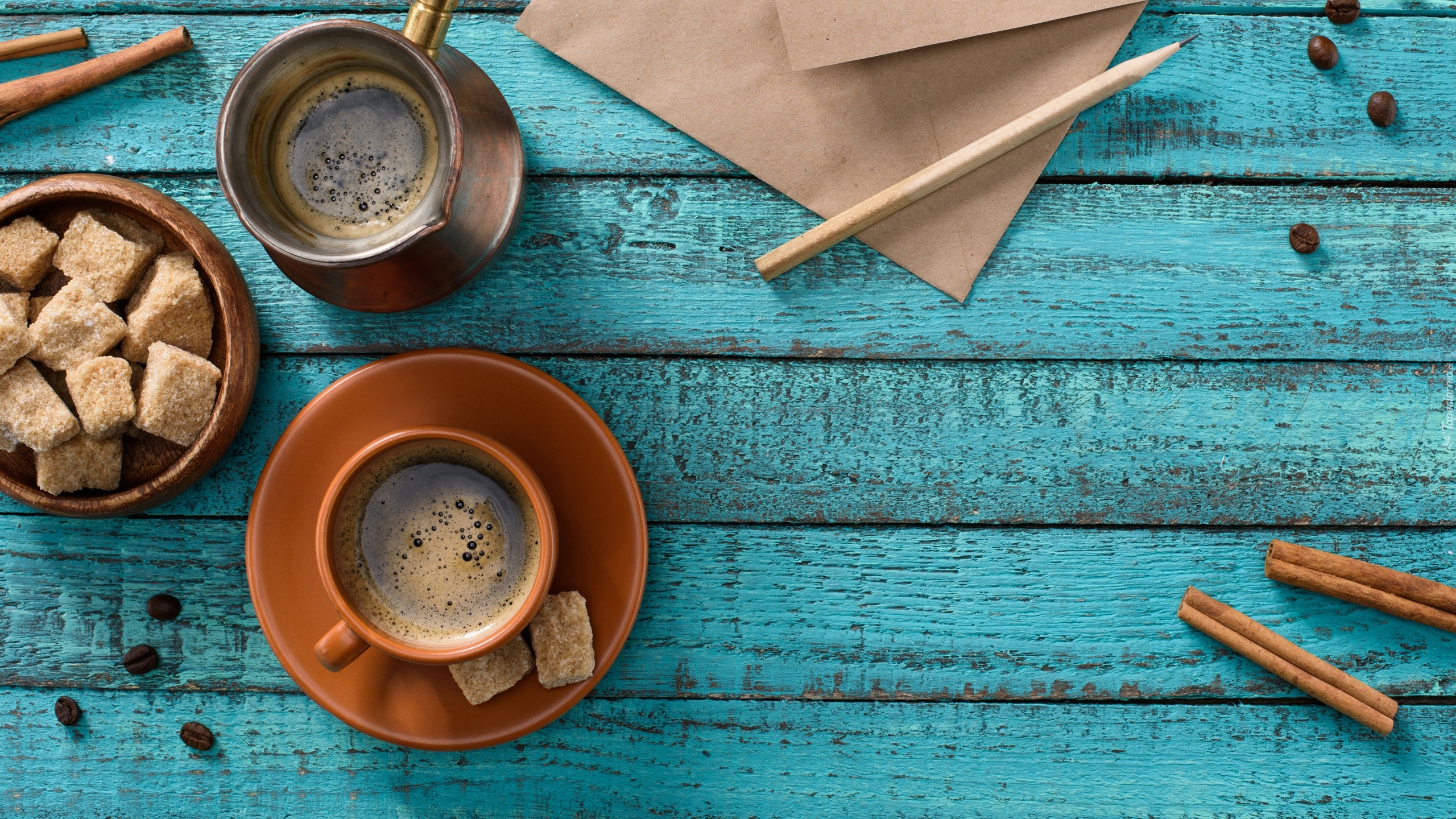 Edytor tapety: Kawa w brązowej filiżance obok kostek cukru