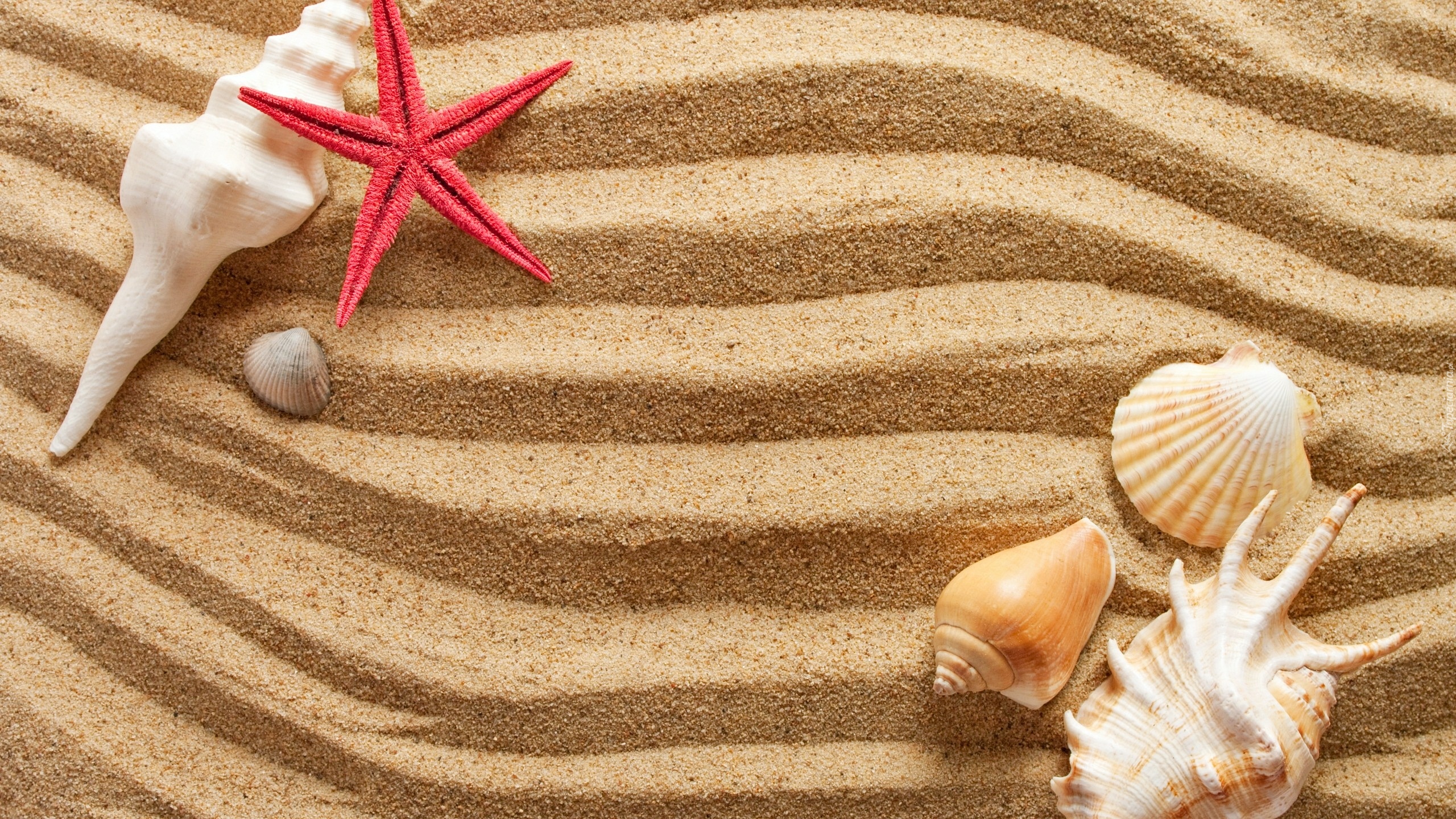 Edytor tapety: Czerwona rozgwiazda i muszelki na piasku