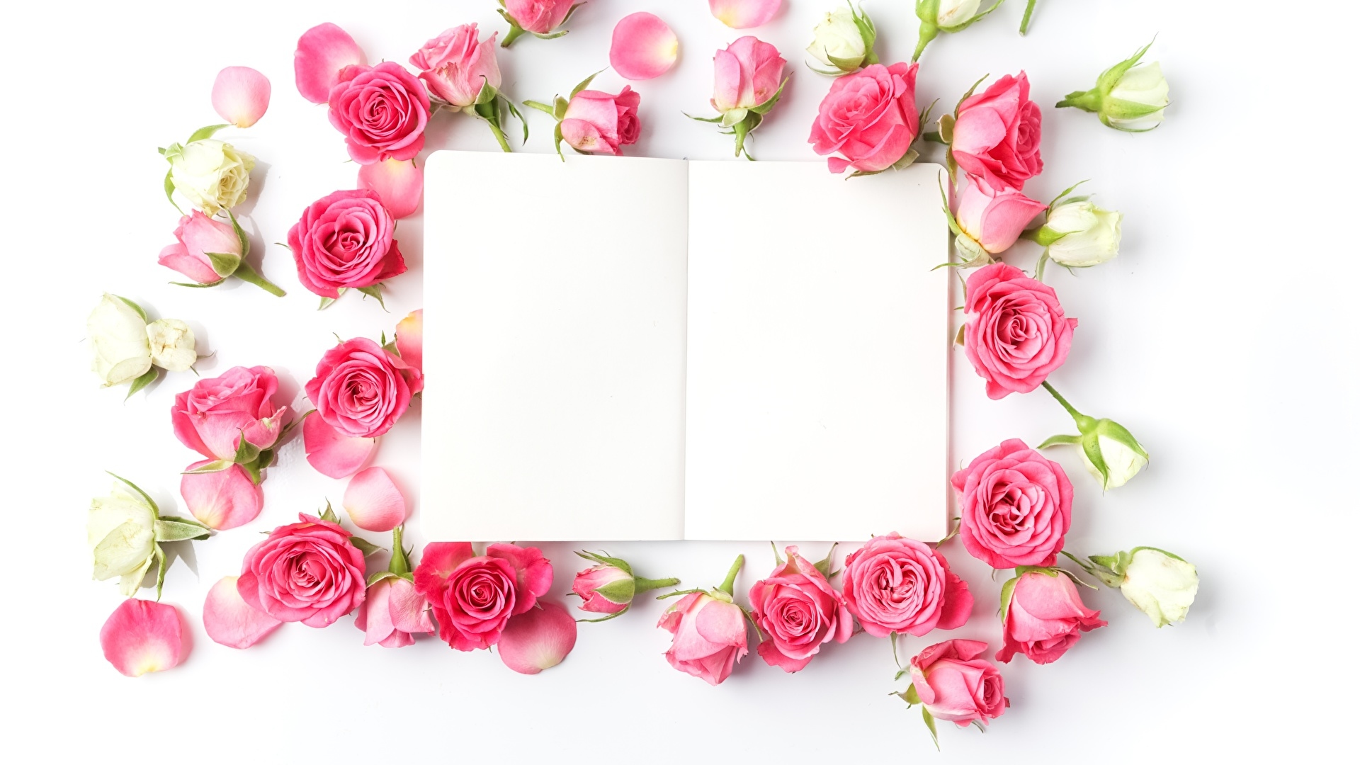 Edytor tapety: Różowe i białe róże ułożone wokół kartki