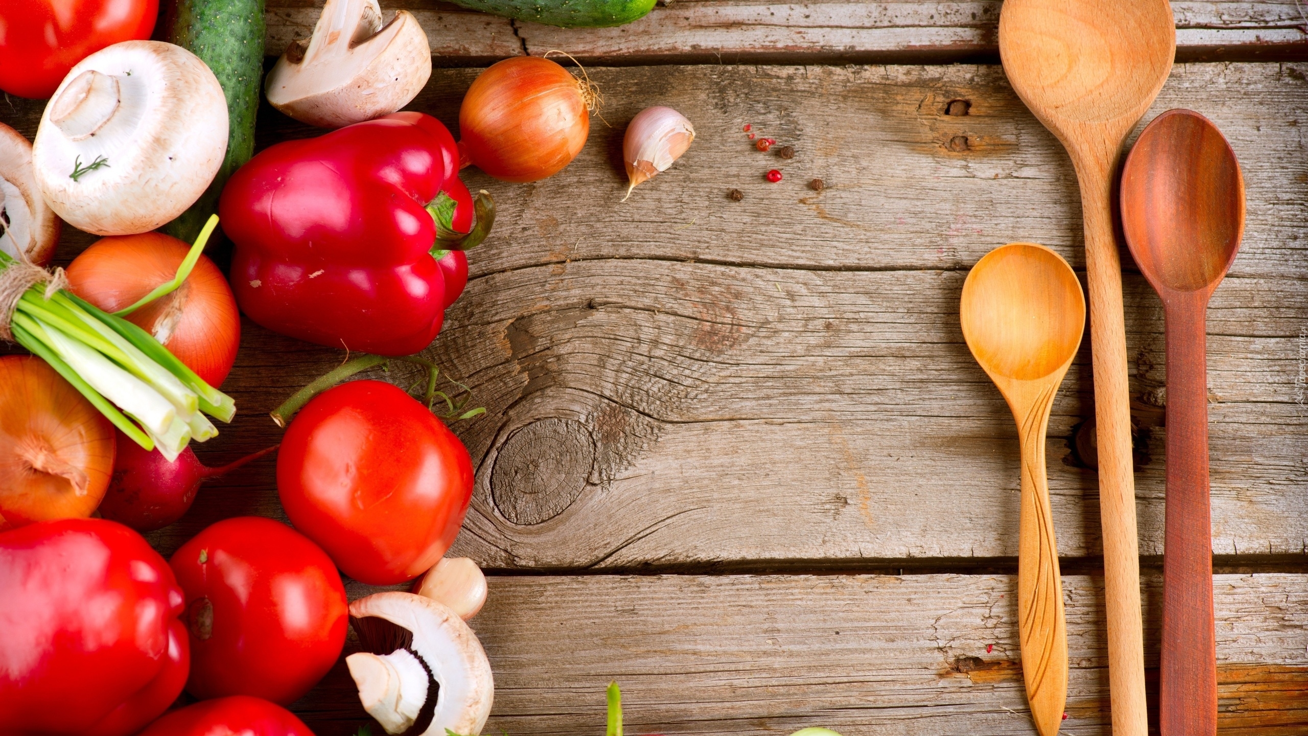 Edytor tapety: Drewniane łyżki położone na deskach obok warzyw