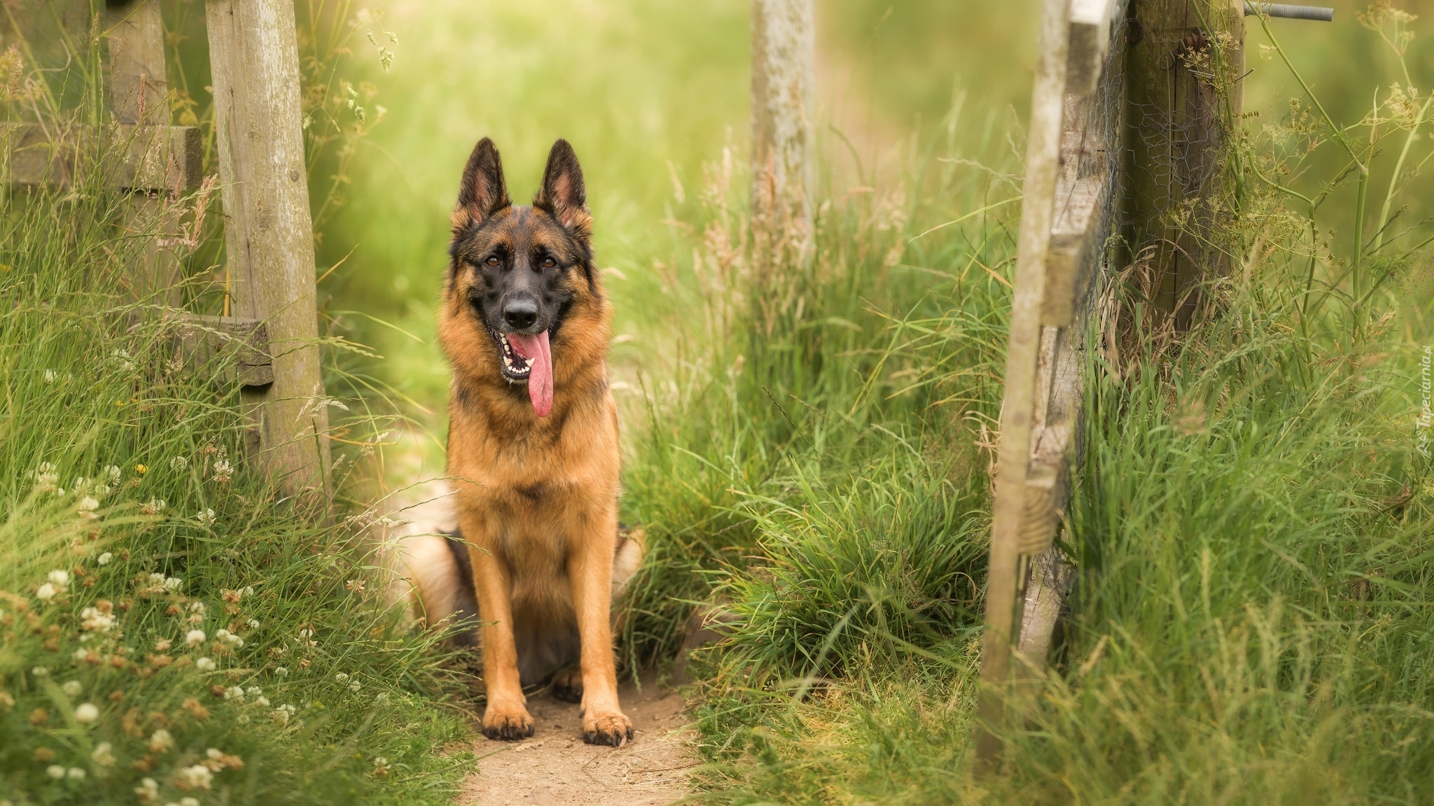 Edytor tapety: Owczarek niemiecki na ścieżce pomiędzy drzewami