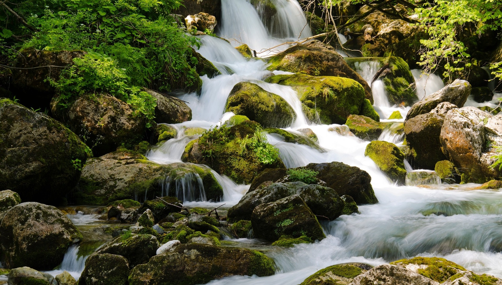 Edytor tapety: Woda z wodospadu spływająca po omszałych kamieniach