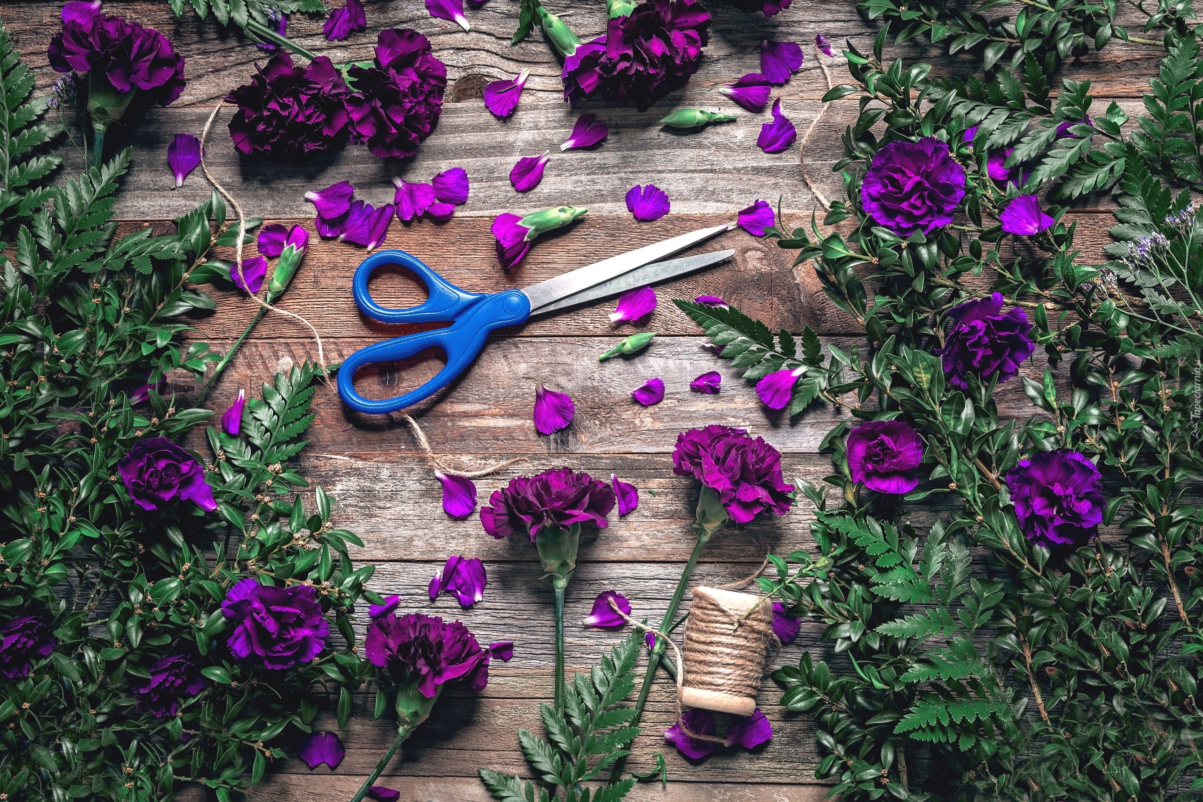 Edytor tapety: Goździki i liście paprotki na deskach