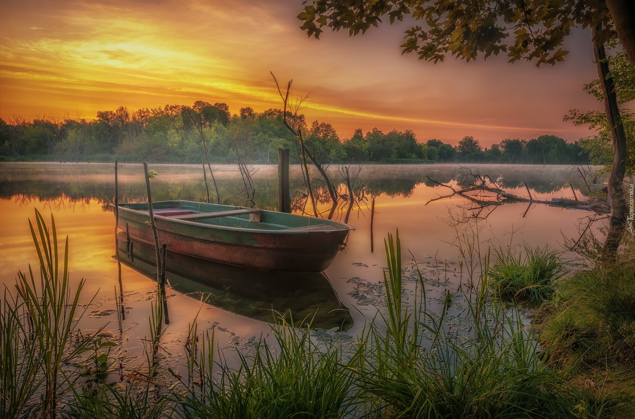 Edytor tapety: Łódź na jeziorze w blasku wschodzącego słońca