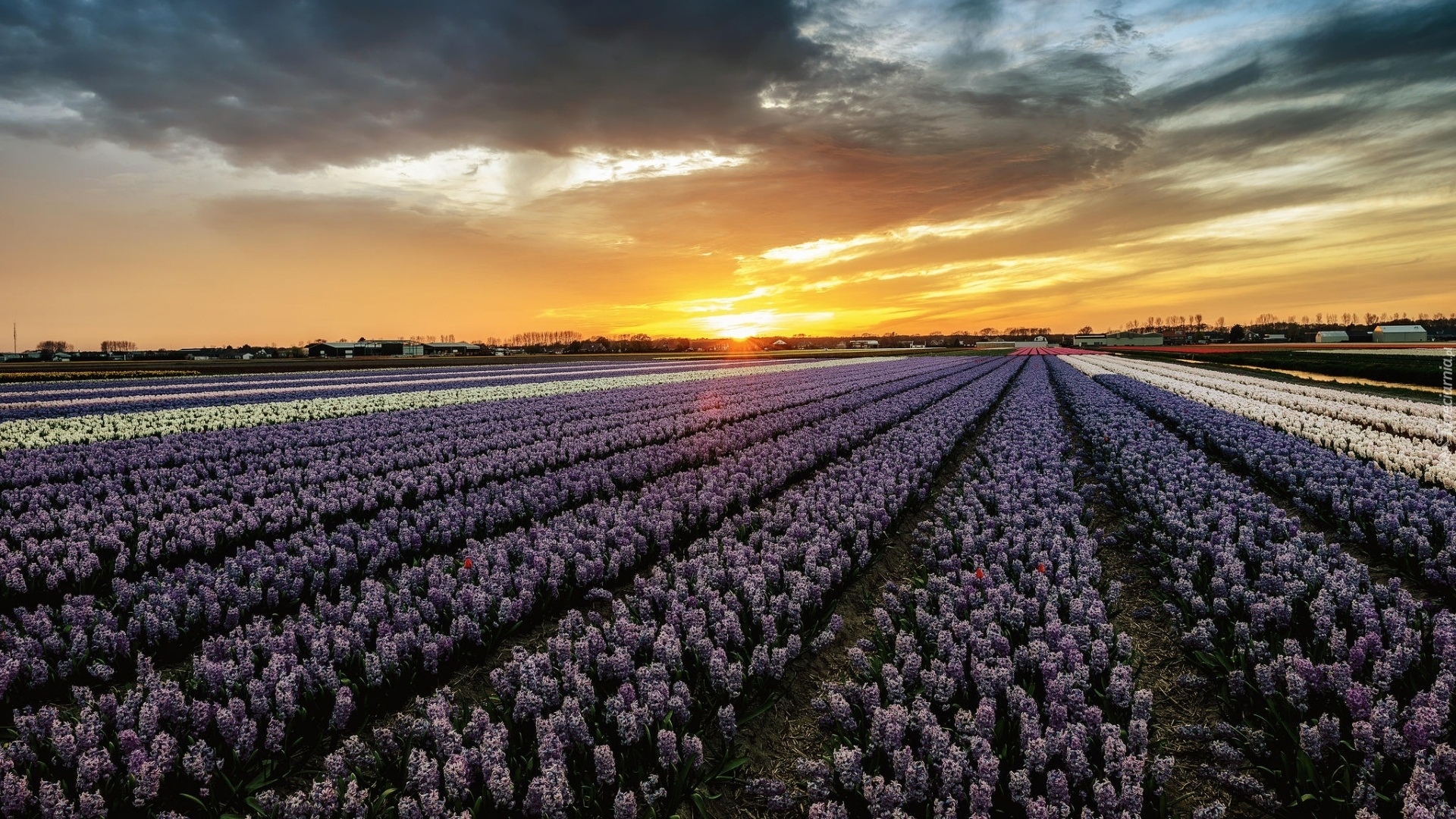 Edytor tapety: Plantacja hiacyntów w blasku zachodzącego słońca