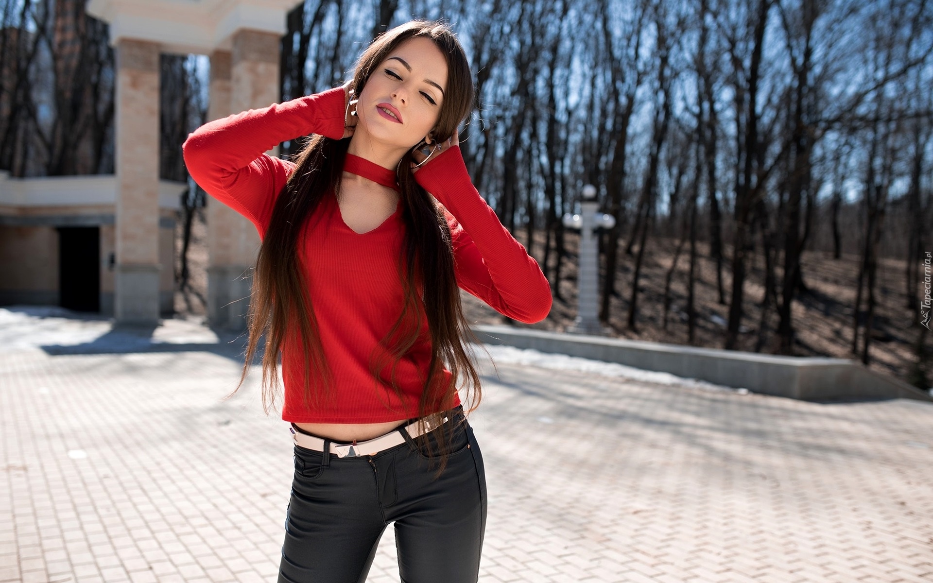 Edytor tapety: Rozmarzona dziewczyna w czerwonym swetrze