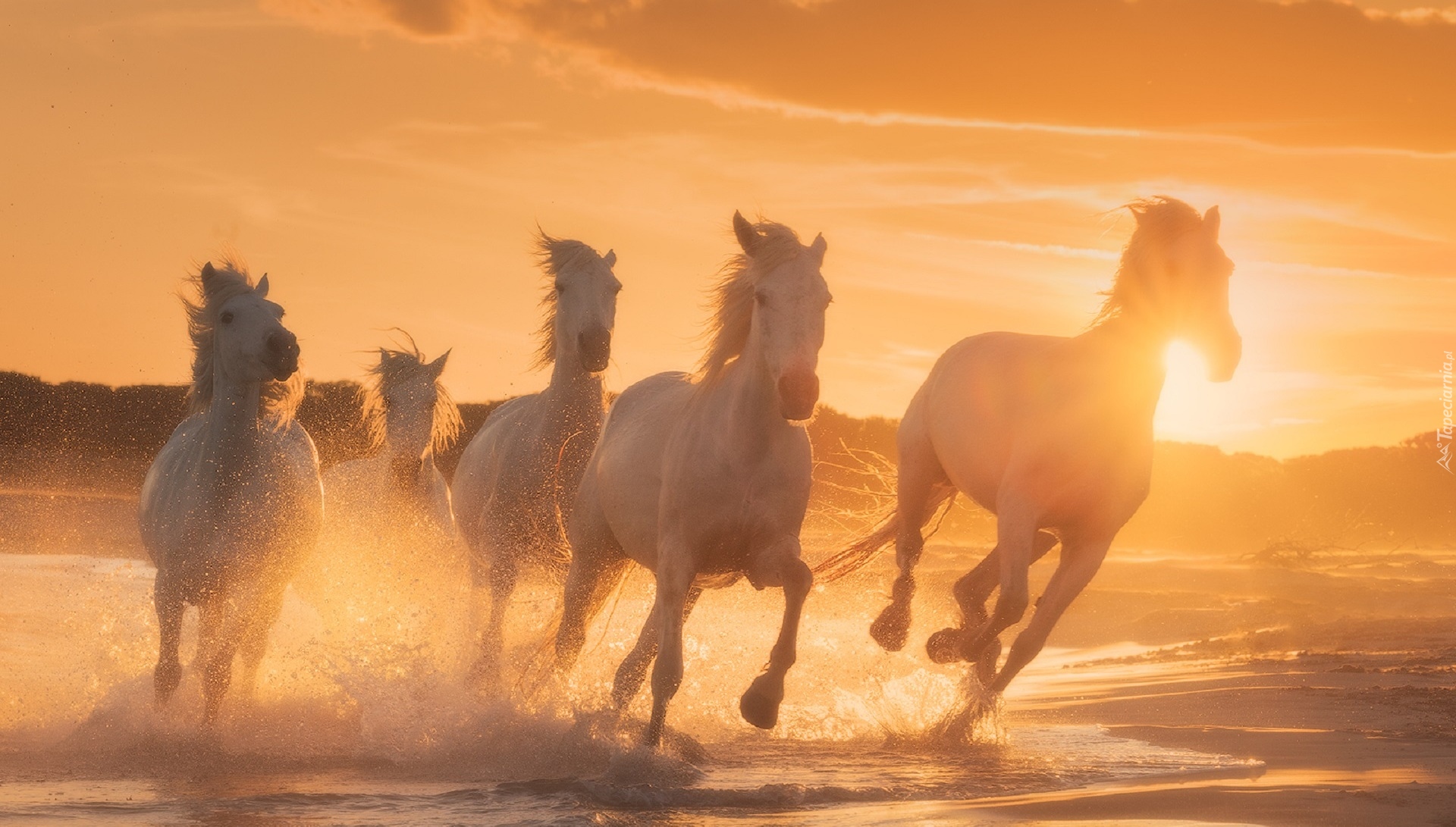 Edytor tapety: Konie biegnące przez wodę w promieniach słońca