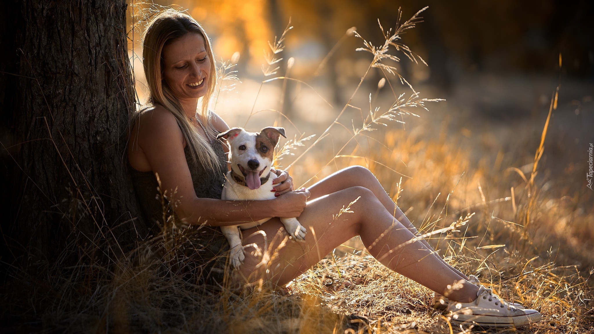 Edytor tapety: Kobieta z pieskiem siedząca pod drzewem