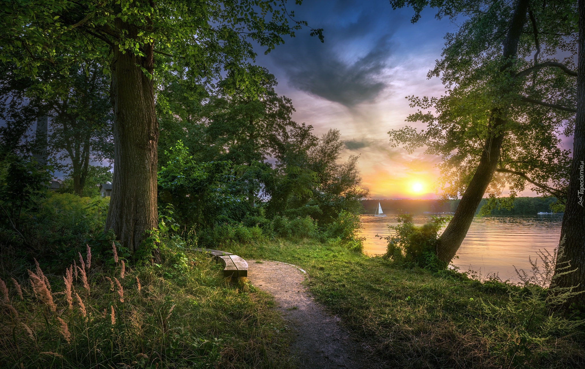 Edytor tapety: Ławka w parku z widokiem na jezioro