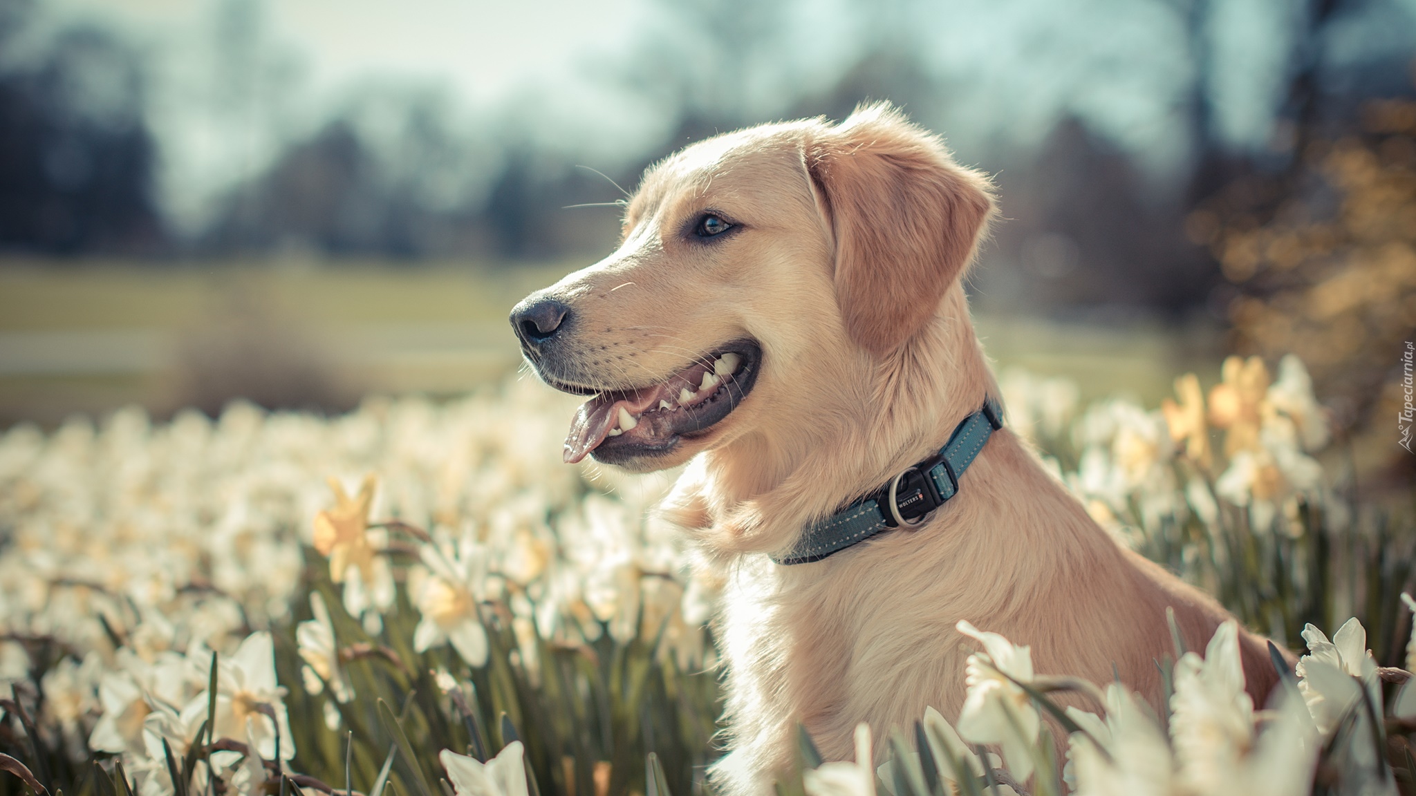 Edytor tapety: Golden retriever w kwiatach