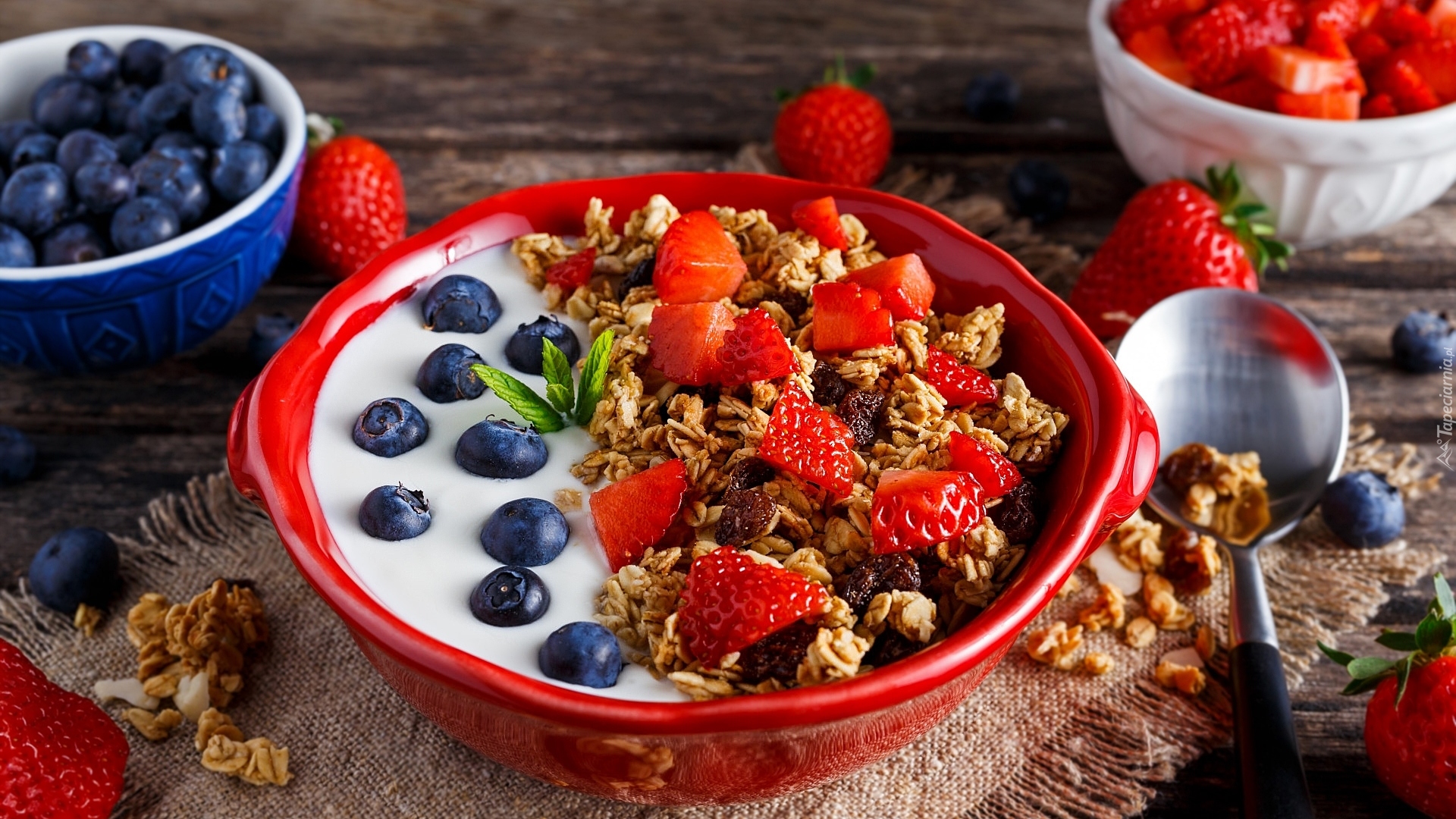 Edytor tapety: Czerwona miseczka z jogurtem i owocami