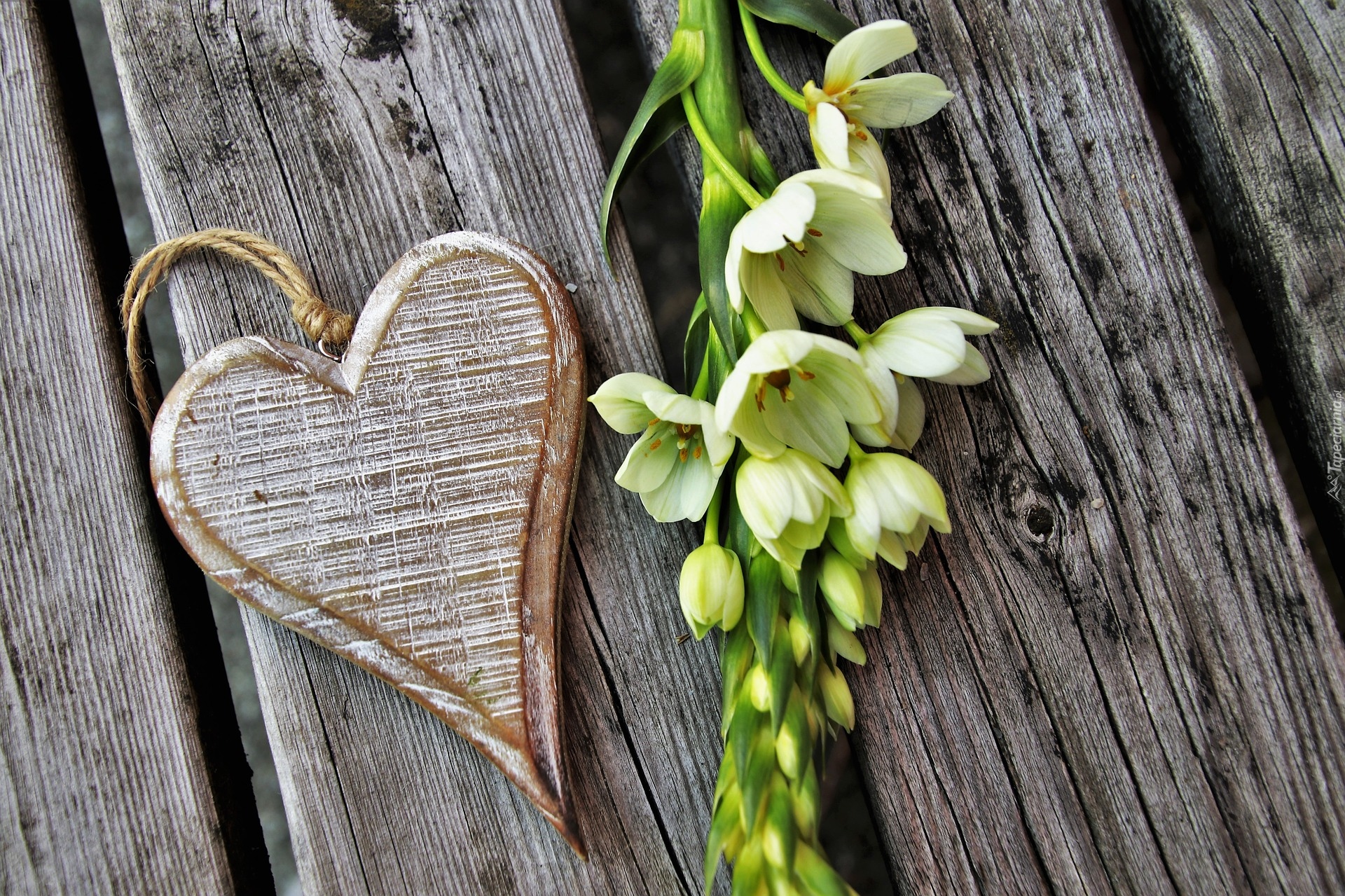 Edytor tapety: Drewniane serce obok białych kwiatów