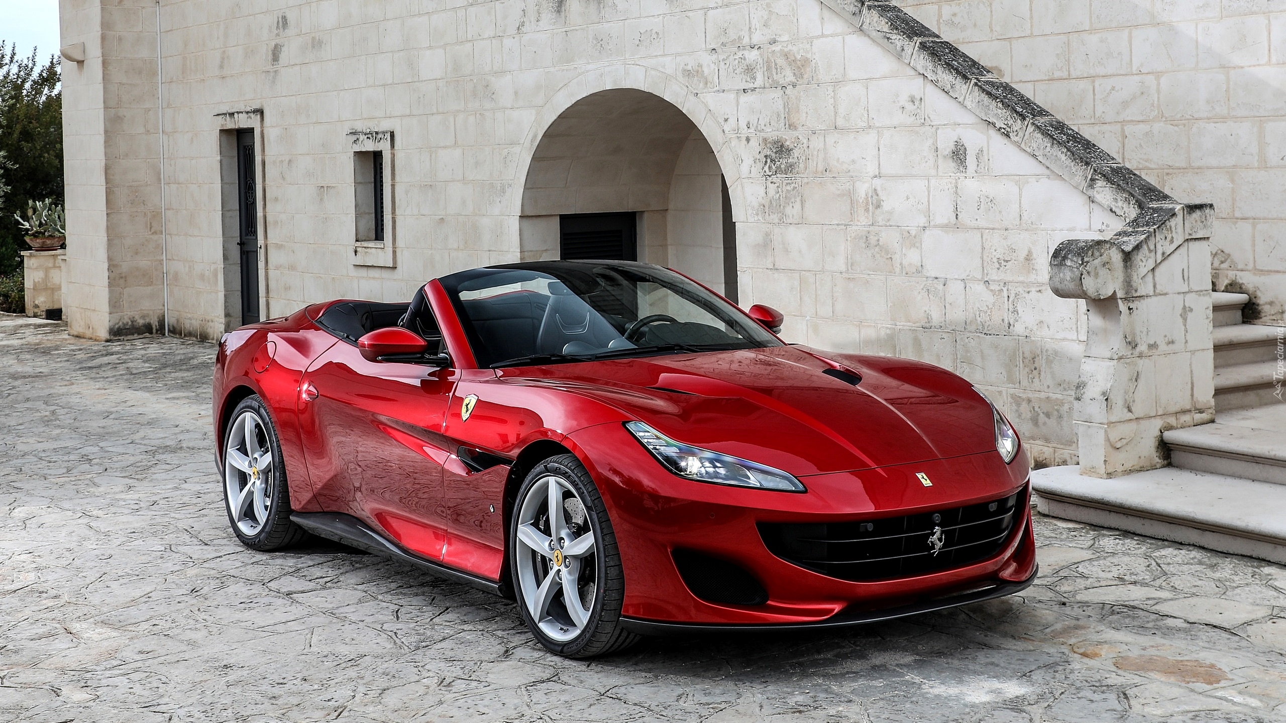 Edytor tapety: Czerwone Ferrari Portofino przed budynkiem