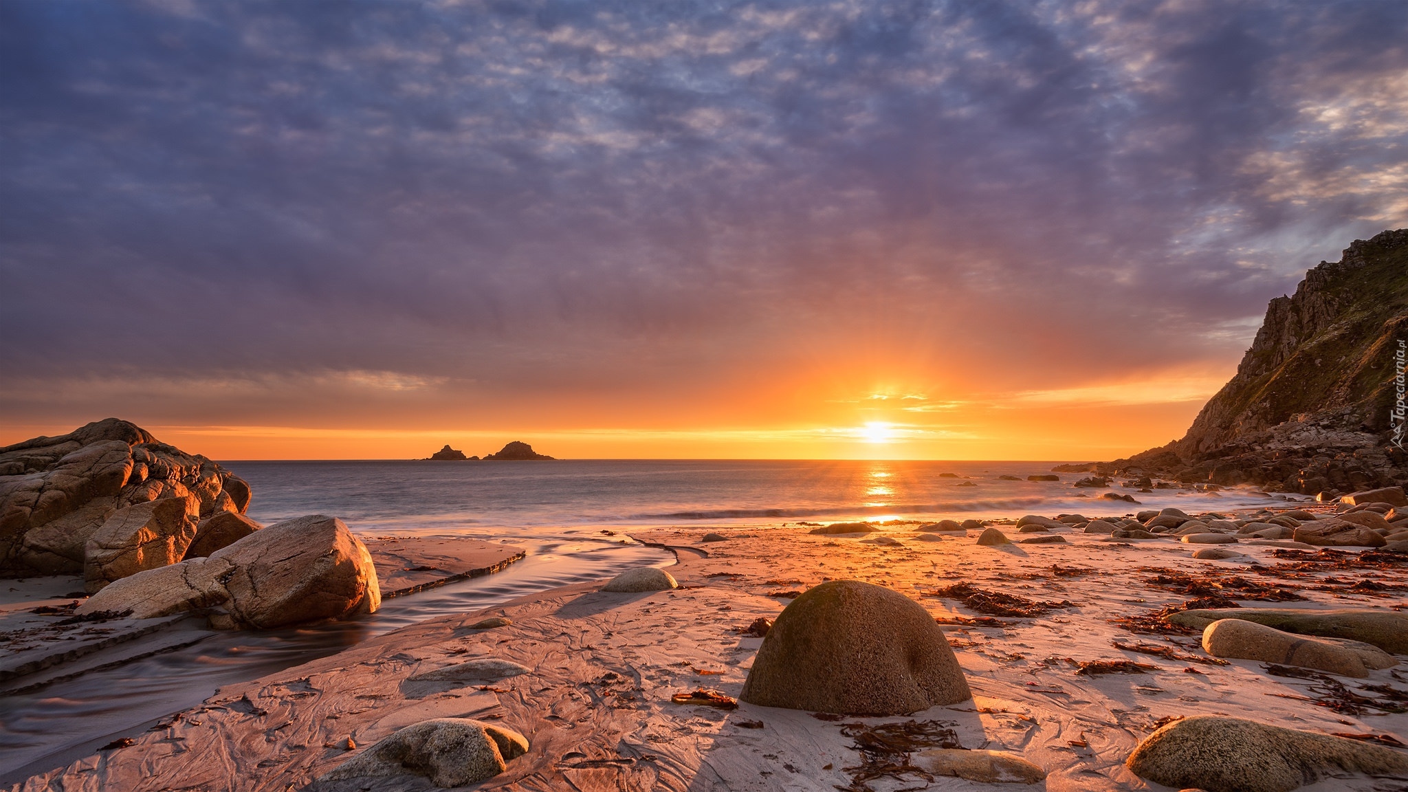 Edytor tapety: Skały na brzegu morza o wschodzie słońca