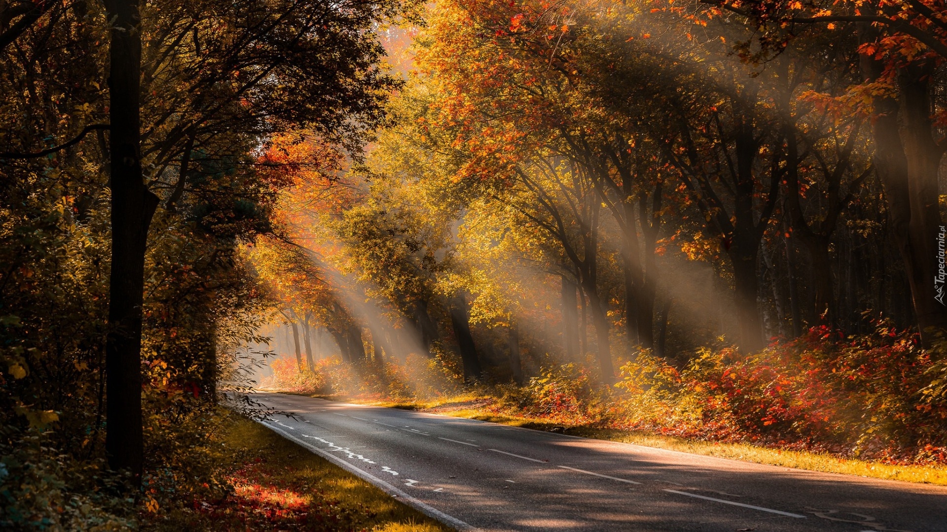 Edytor tapety: Światło słoneczne padające na drogę w lesie
