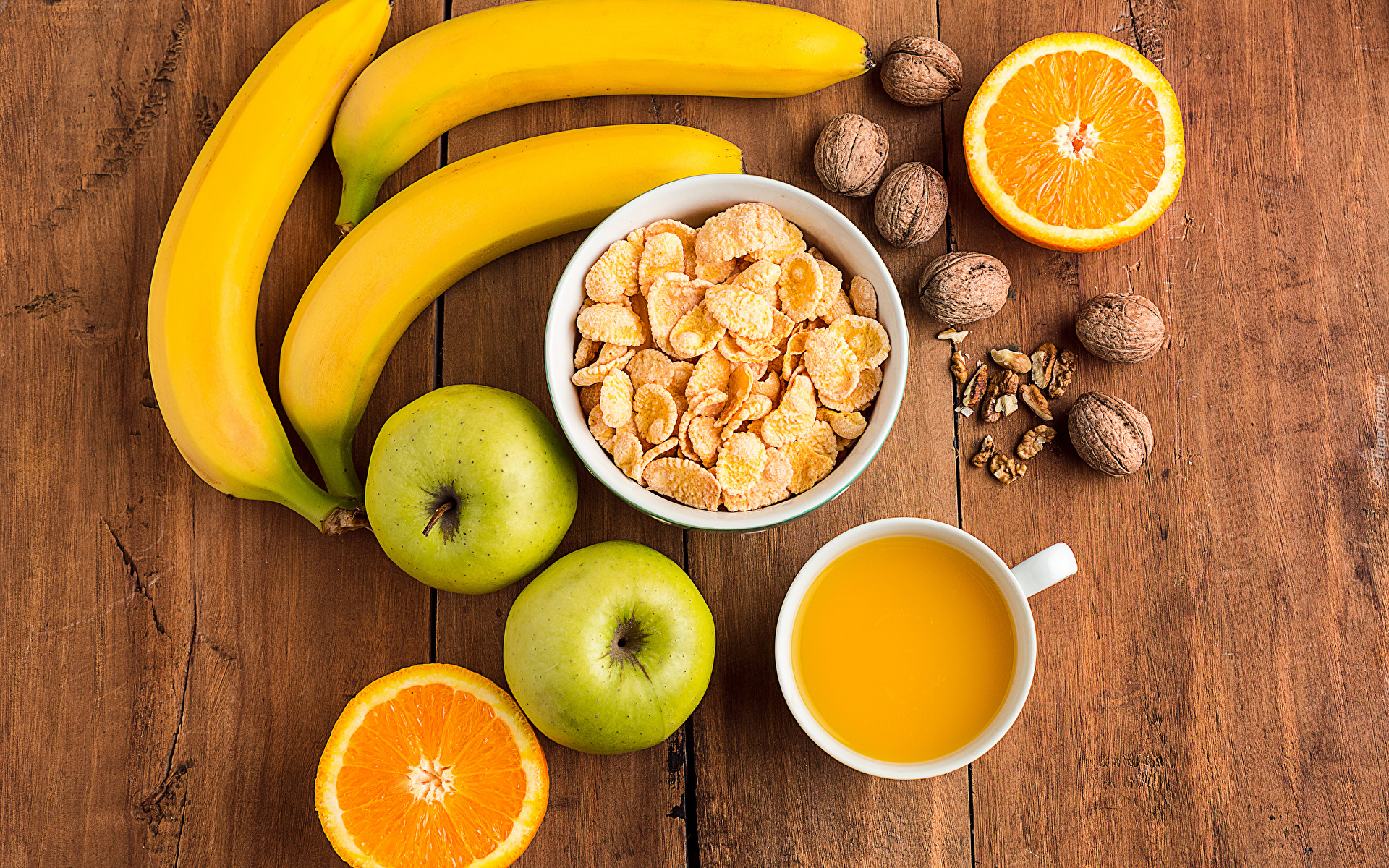 Edytor tapety: Sok pomarańczowy obok jabłek i bananów na deskach