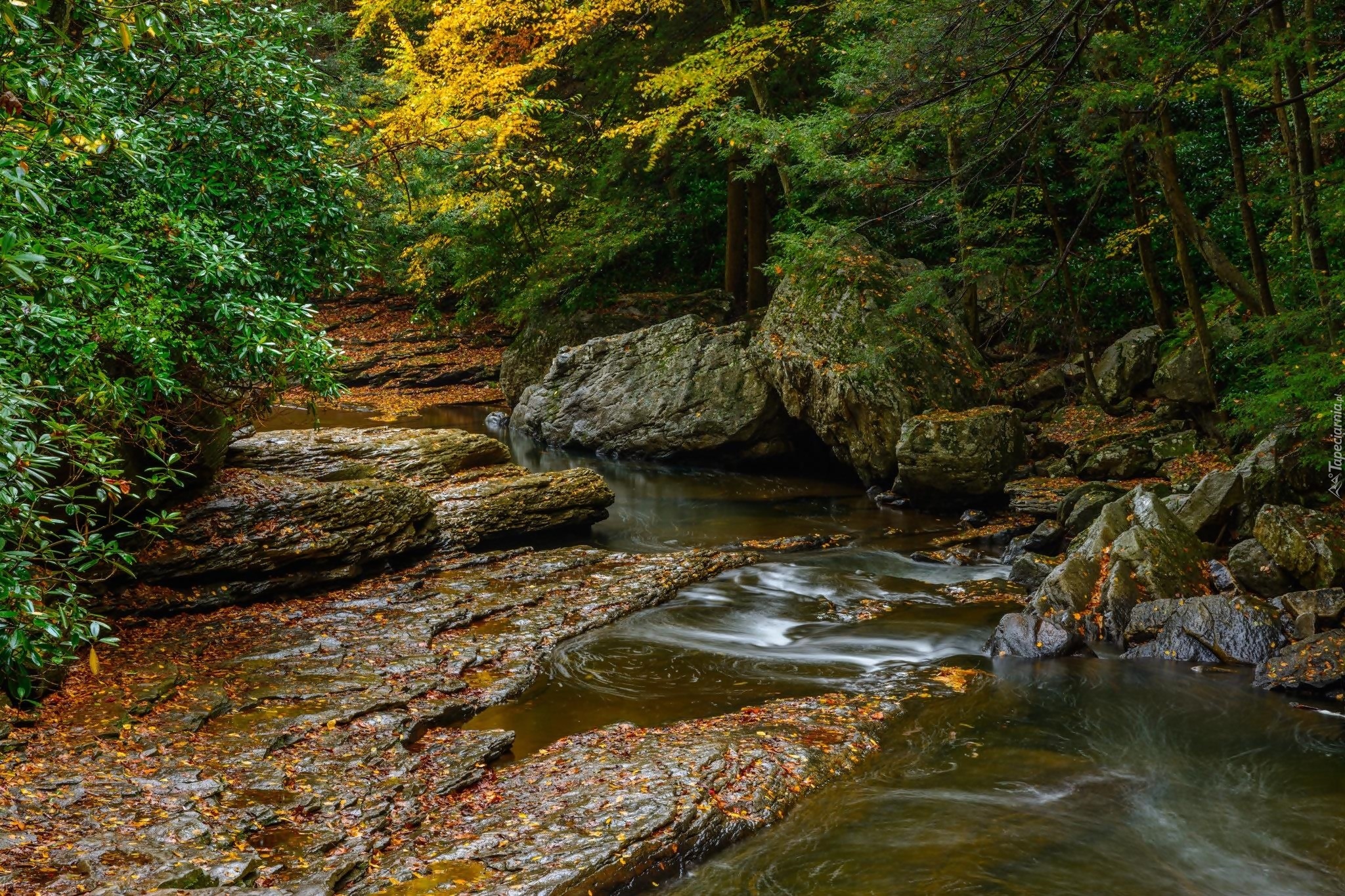 Edytor tapety: Rzeka płynąca obok skał i kamieni w lesie