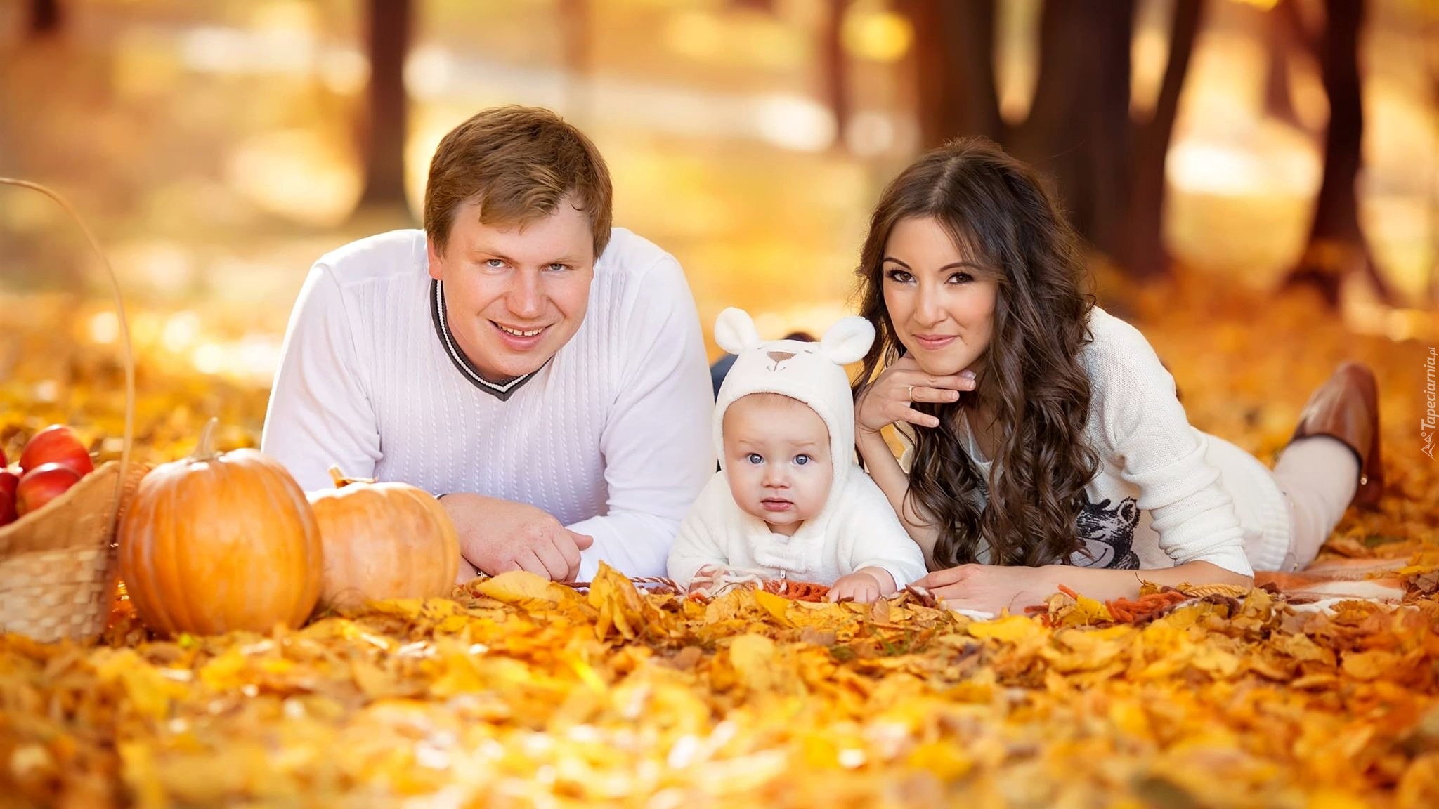 Edytor tapety: Rodzice z dzieckiem pozują do zdjęcia obok dyń