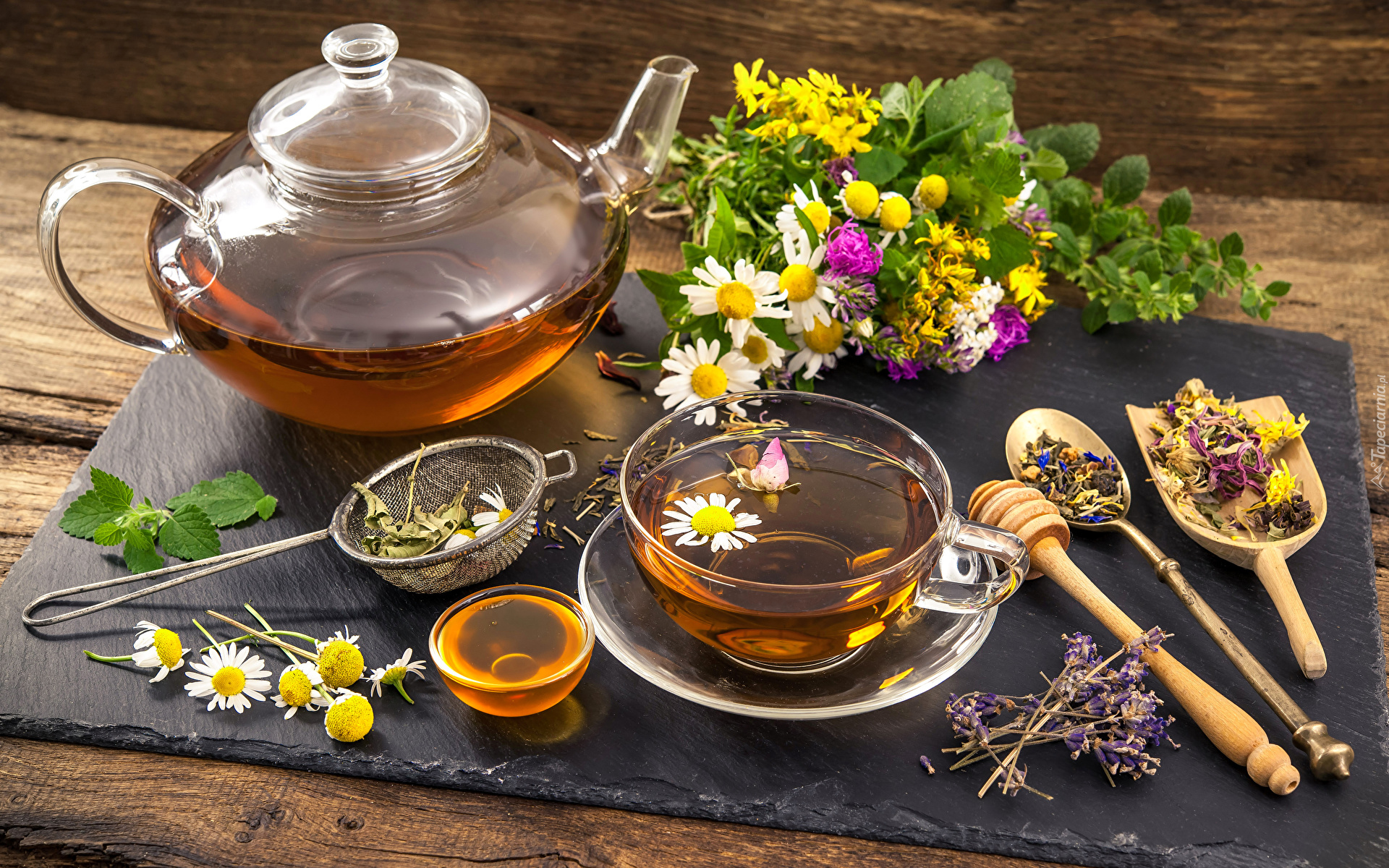 Edytor tapety: Zioła położone obok dzbanka i filiżanki z herbatą