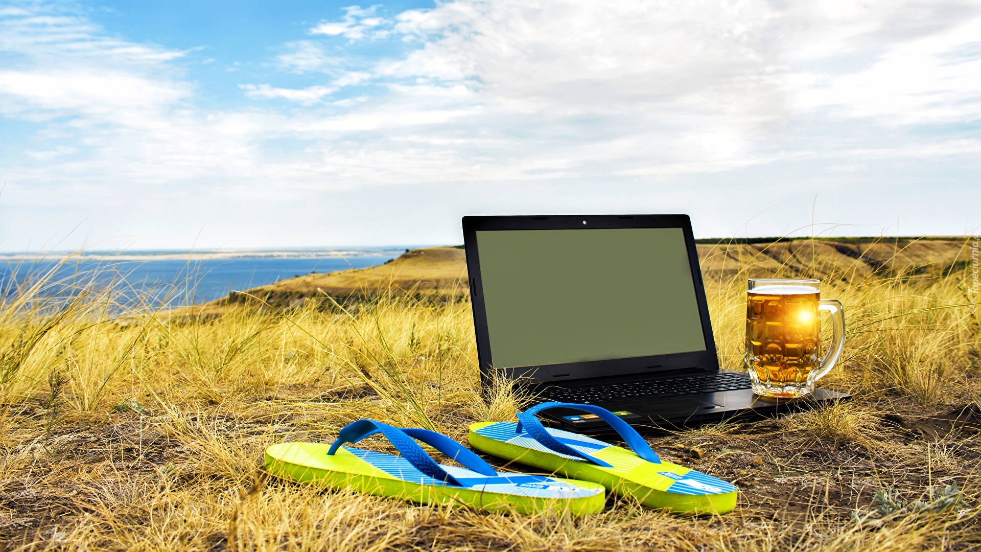 Edytor tapety: Kufel piwa z laptopem i japonkami na trawie