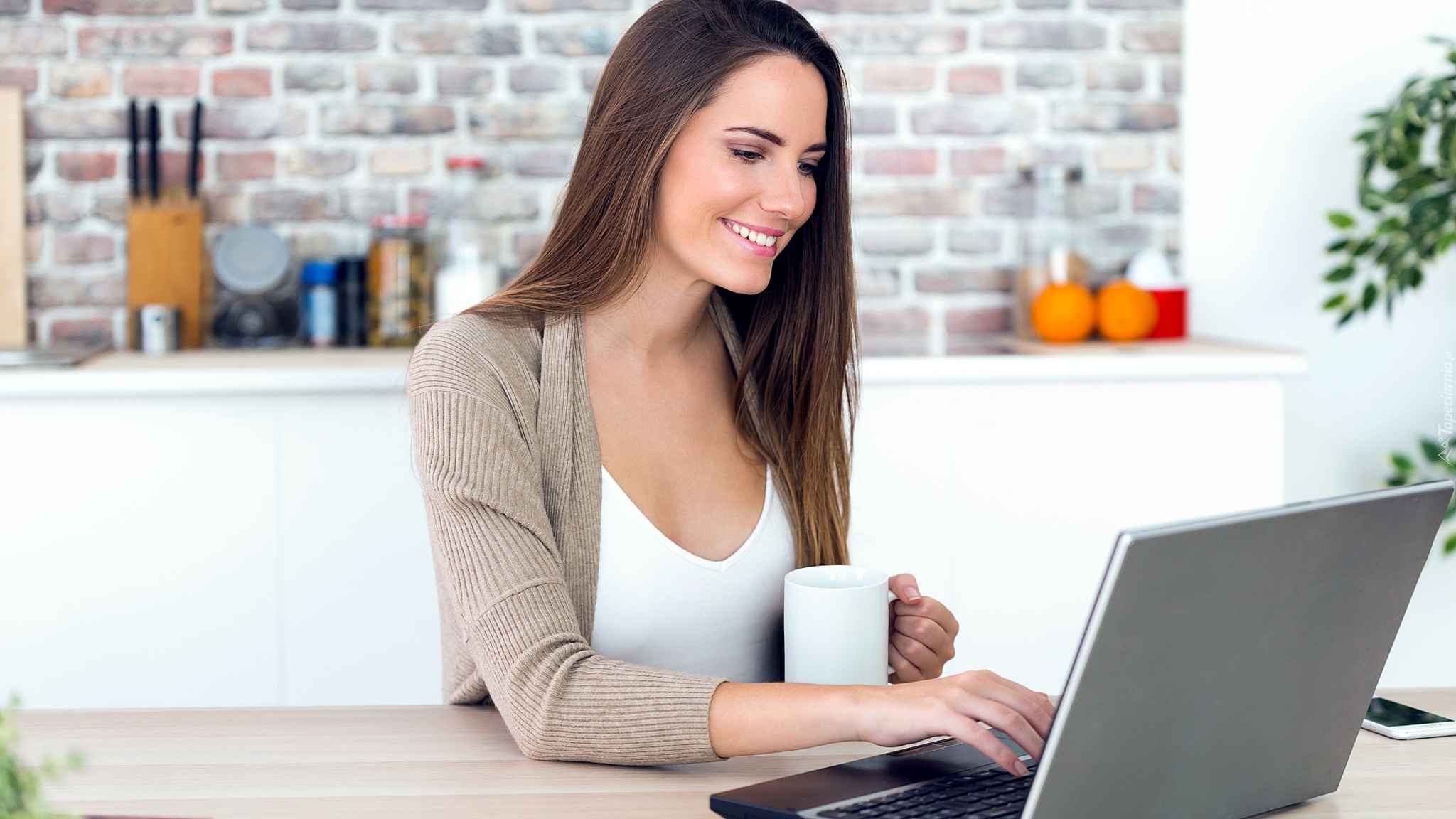 Edytor tapety: Kobieta z kubkiem kawy przy laptopie